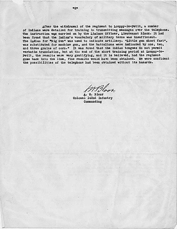 Letter from the Commanding Officer of the 142nd Infantry to the Commanding General of the 36th Division, stating how messages would be transmitted during World War I in Choctaw as the enemy could not decipher the messages