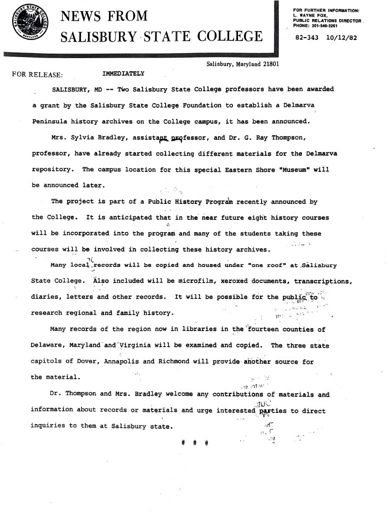 Press release announcing the establishment of the Delmarva Historical Archives Center at Salisbury State College in 1982.