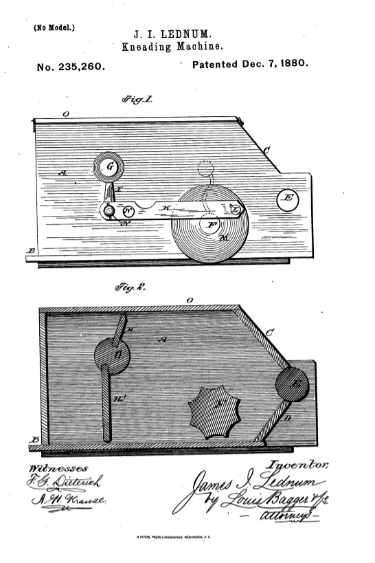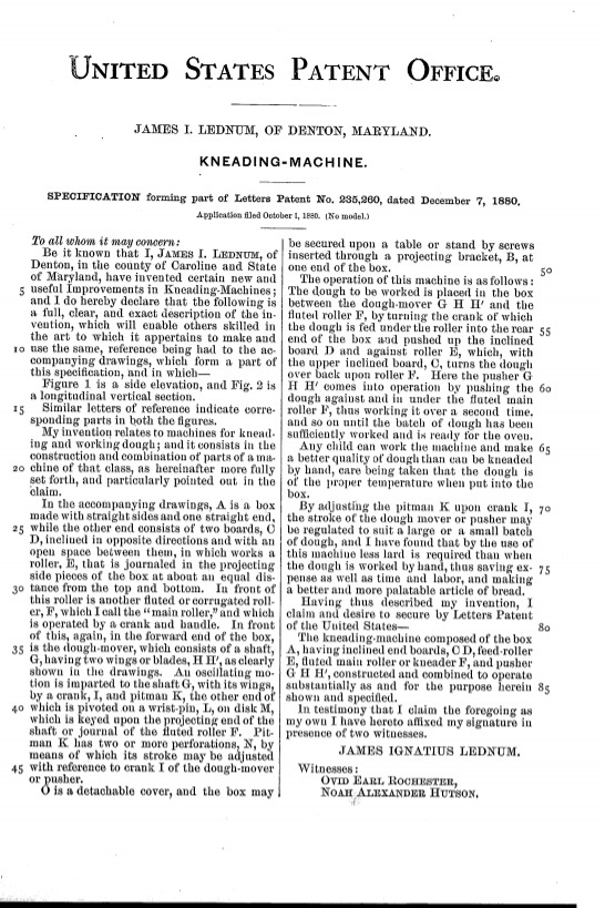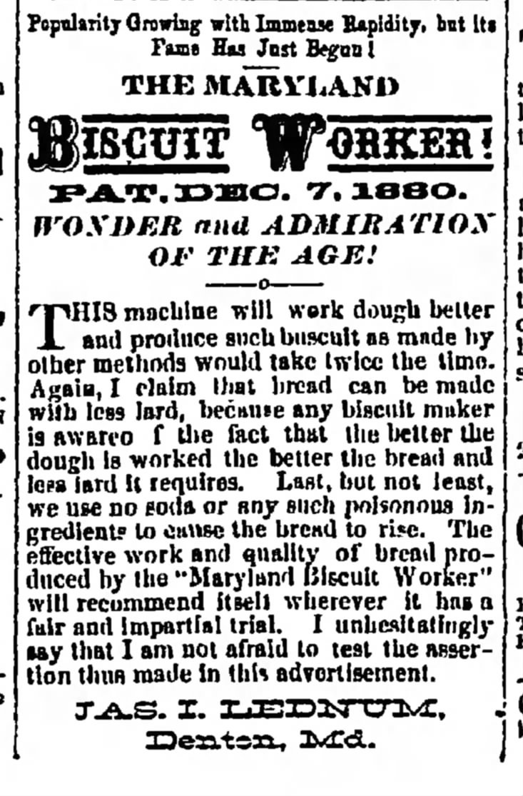 Patented on December 7, 1880, Denton, Maryland local James Ignatius Lednum’s “Kneading Machine” was advertised in the Denton Journal as a way for biscuit workers to make biscuits more quickly. This machine was a roller mounted on a slab of hardwood or marble that was fed biscuit dough as the roller turned to beat and process the dough.