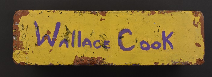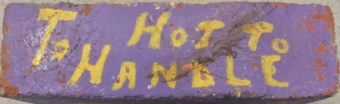 Painted Omega Psi Phi brick with Too Hot to Handle, Greek Letters, and Wallace Cook written on various sides of the surface.