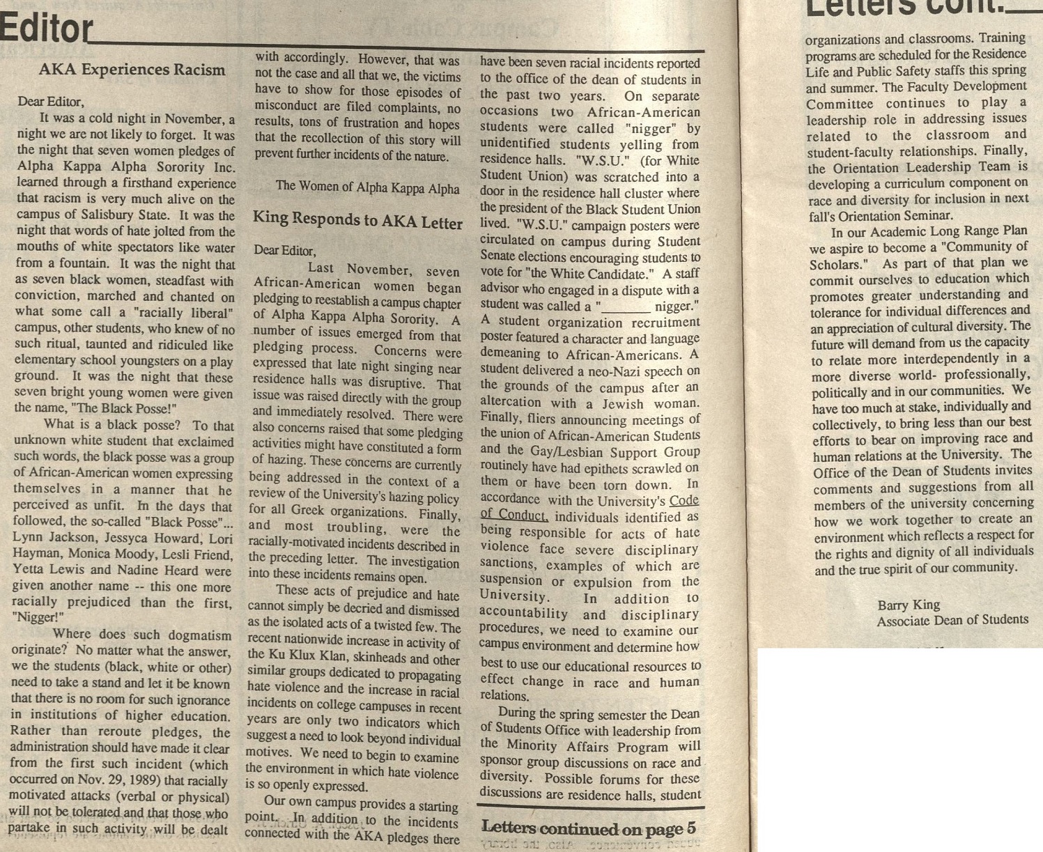 Letters from the Women of AKA detailing the discrimination they faced and a response from SU Associate Dean of Students, Barry King.