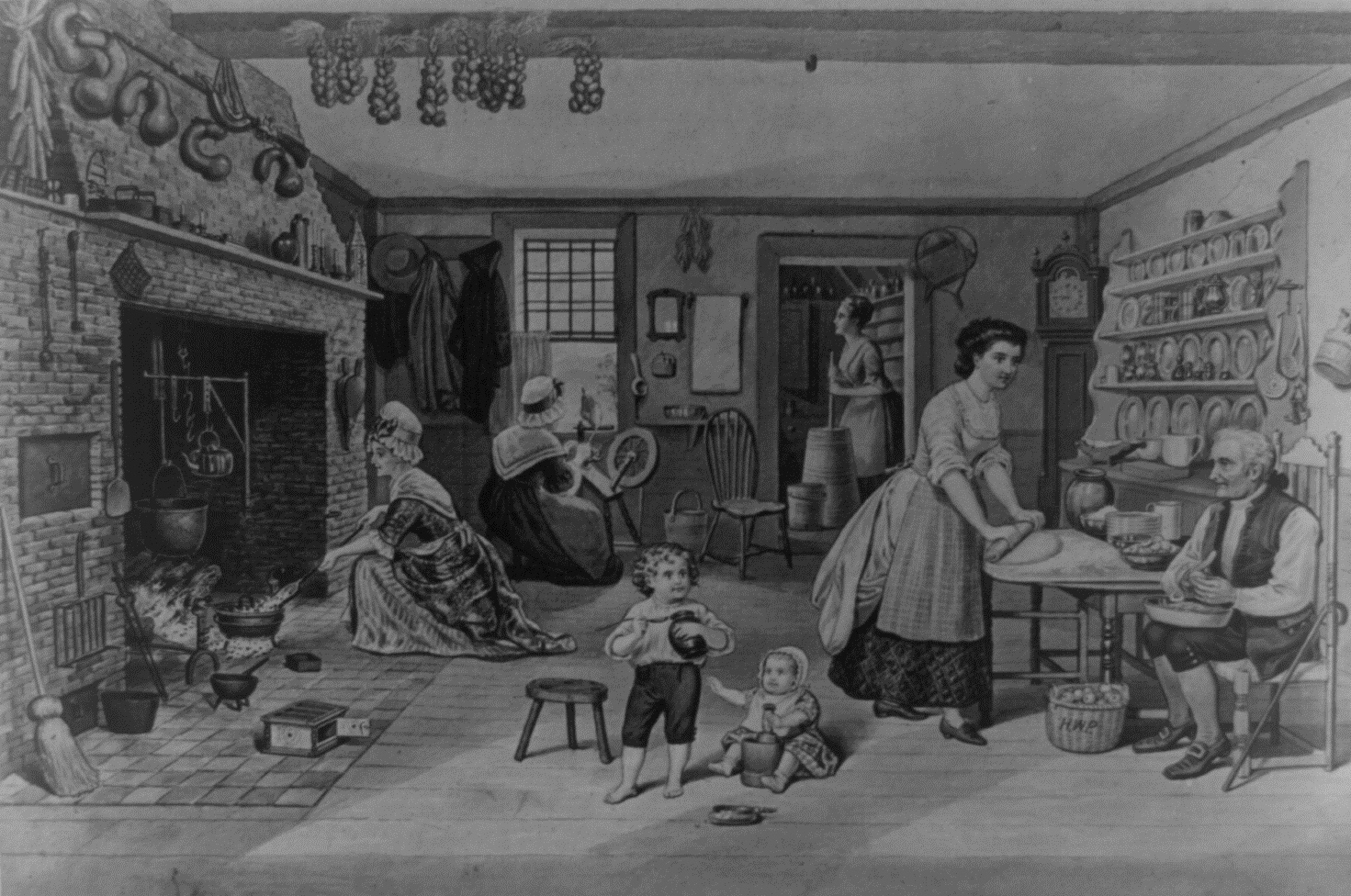 Image shows women, children, and a man working at various activities in a colonial-era kitchen.