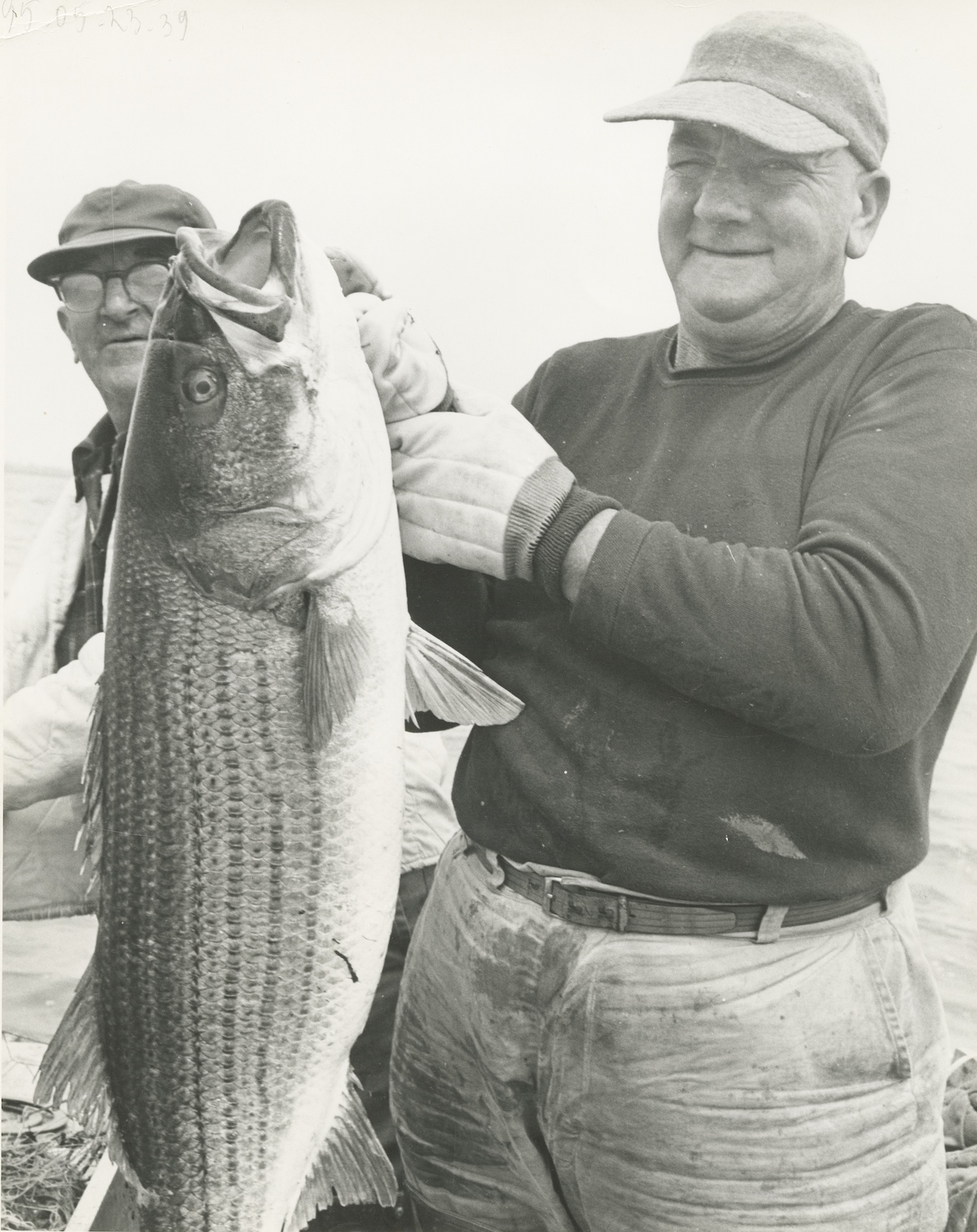 Here are Claude Marvel and Skid in the same plywood boat. Claude is holding up a 40-pound rock. This whopper had to be thrown back by law, but Claude sure was tickled to catch it.
