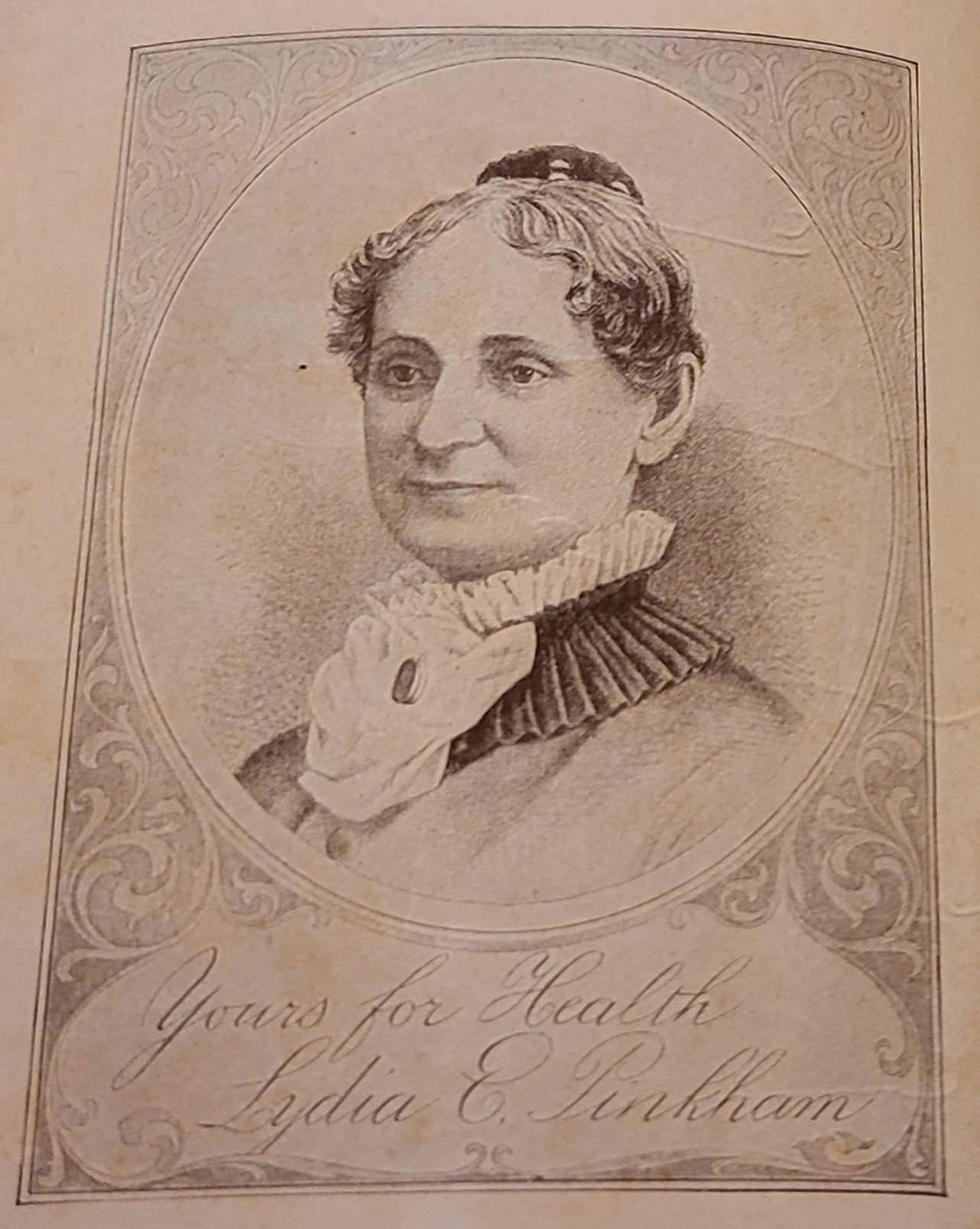 Artist's rendering of Lydia Pinkham with the words, "Yours for Health Lydia Pinkham" beneath