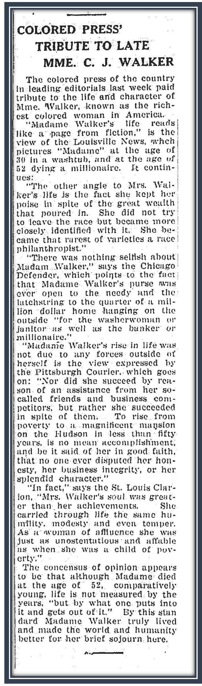 Colored Press' Tribute to Late MME. C. J. Walker, The Baltimore Afro-American 1919
