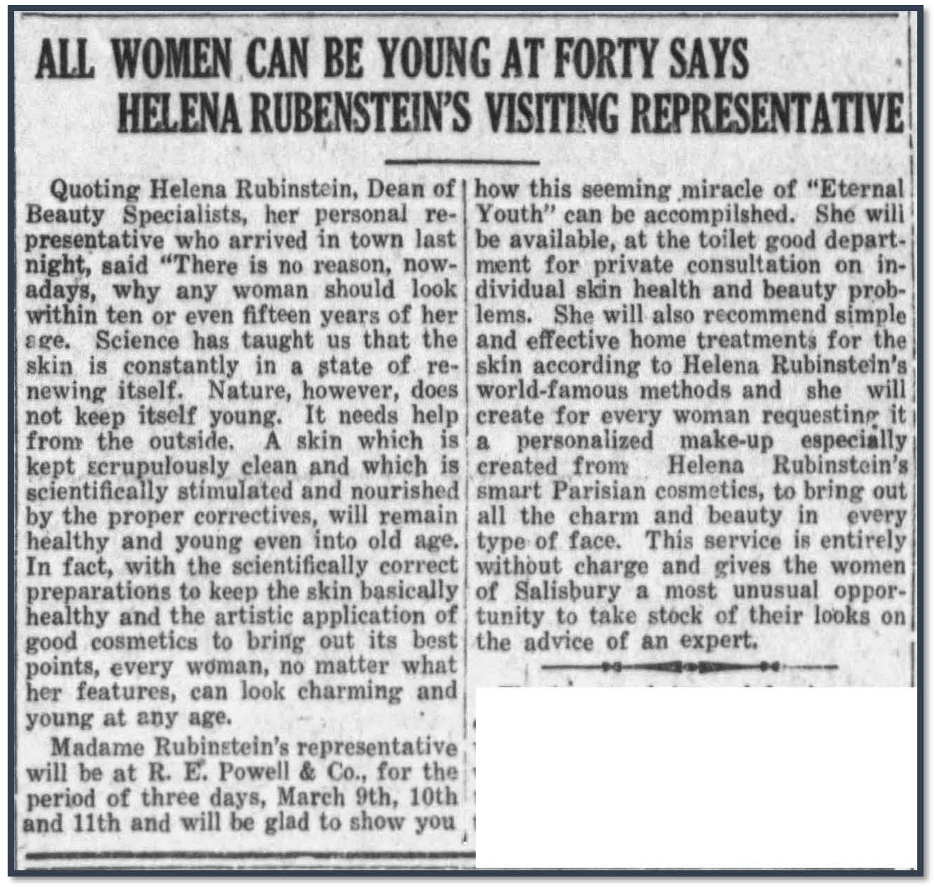 A newspaper article saying that a representative for Helena Rubinstein will be at R. E. Powell & Co. to do a demonstration.