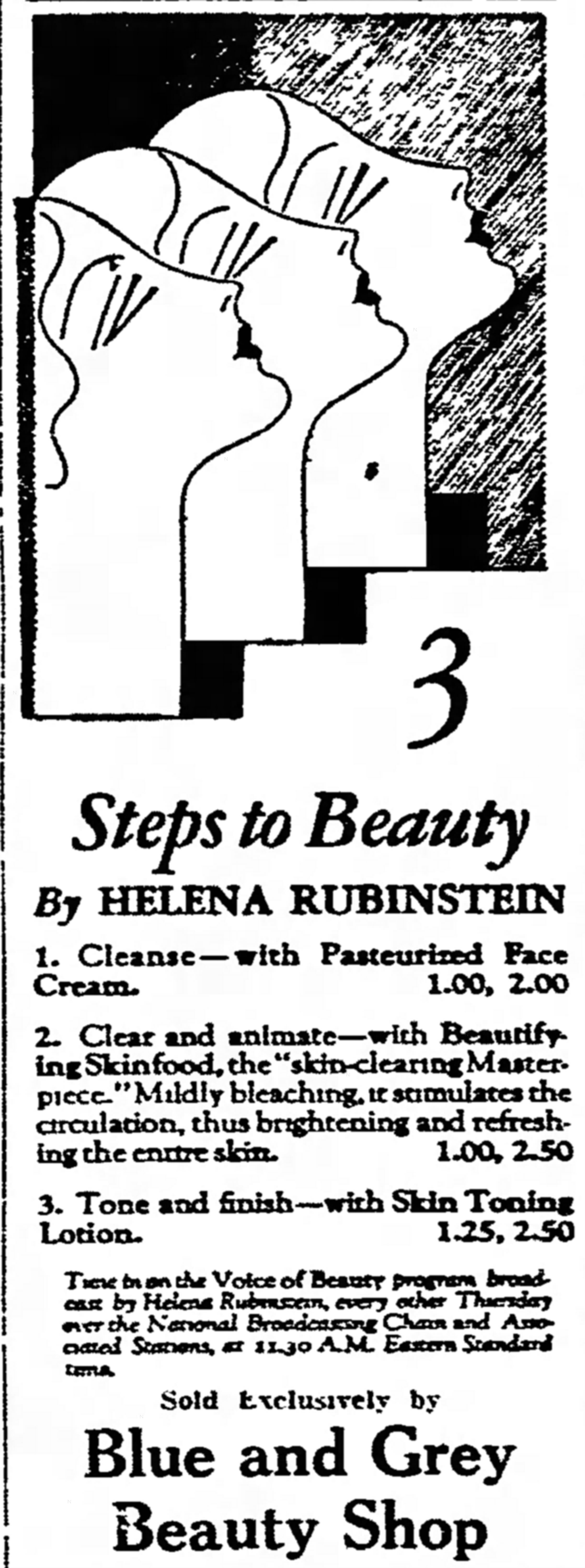 Newspaper article from The Daily News, February 12, 1930. The article describes Rubinstein's skincare products and the order in which they should be used.