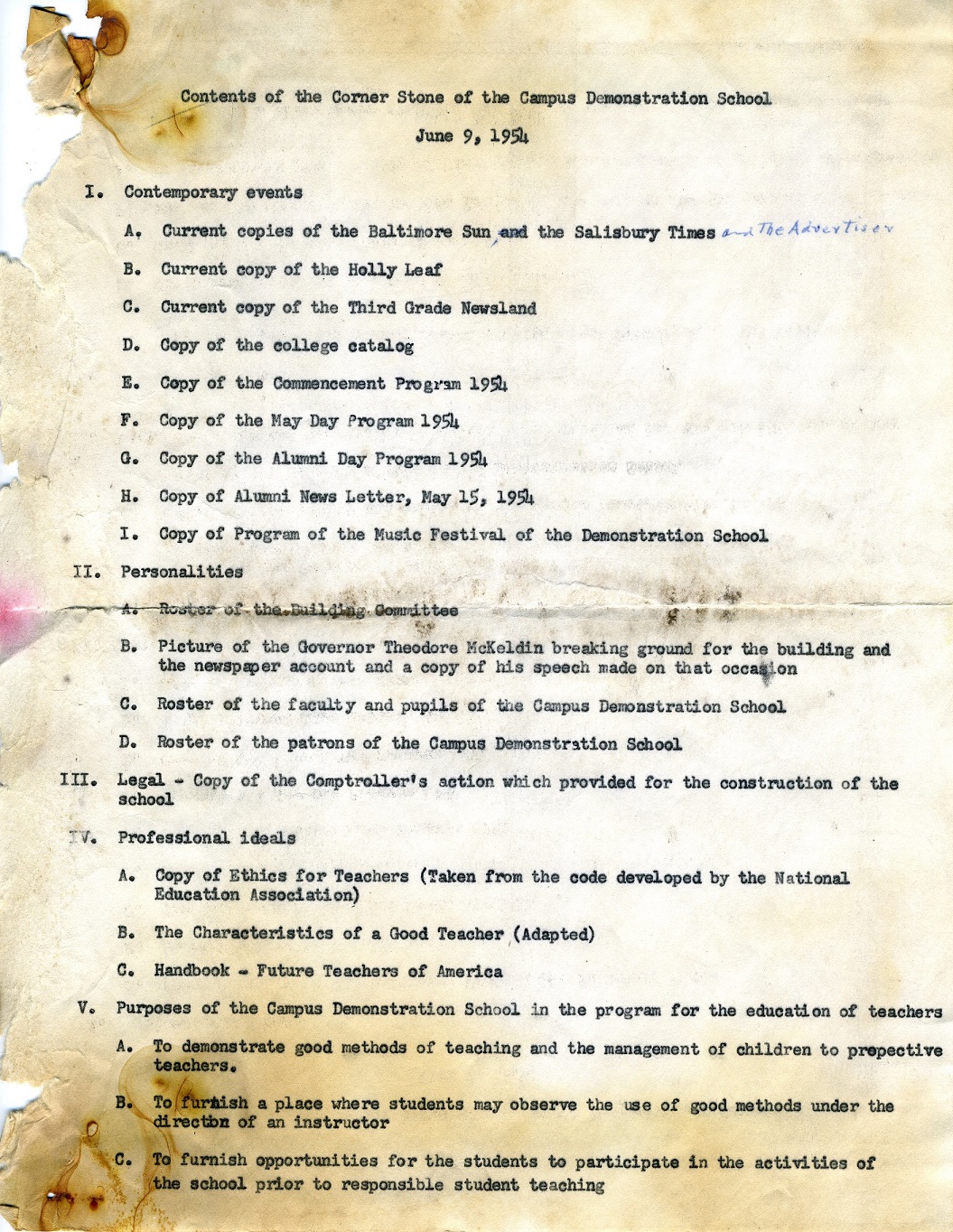 Unknown, “Campus Elementary School cornerstone contents list (page 1), 1954,” Nabb Research Center Online Exhibits, accessed December 14, 2025, http://www.sulibraries.org/nabb-online/items/show/205.