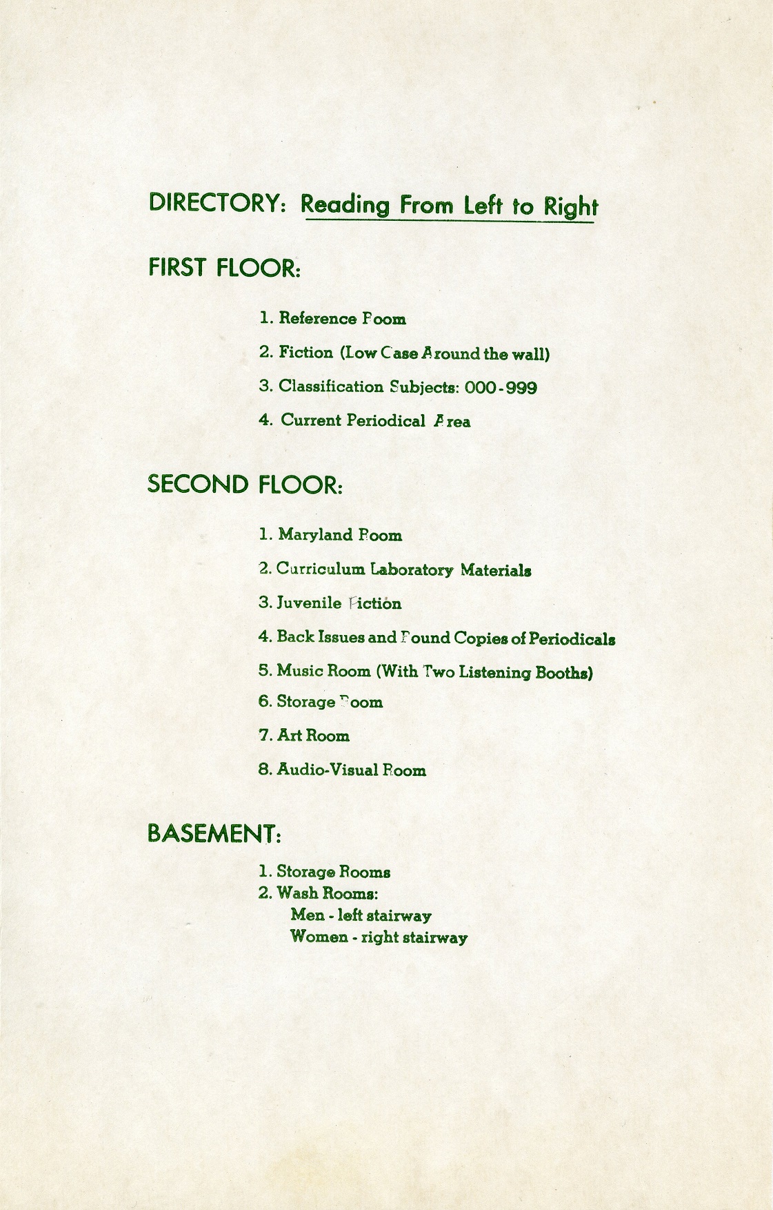 Unknown, “College Library Floor Directory, circa 1960,” Nabb Research Center Online Exhibits, accessed December 14, 2025, http://www.sulibraries.org/nabb-online/items/show/210.