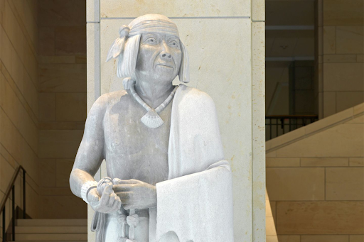 Marble statue of Po'pay, a Pueblo Indian responsible for organizing the Pueblo revolt against the Spanish. The statue is located in the National Statuary Hall Collection in Washington D.C.
