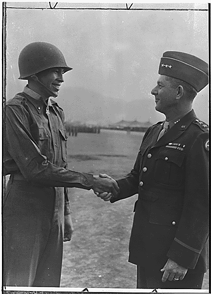 Lt. Ernest Childers, a Creek, being congratulated by Gen. Jacob L. Devers after receiving the Congressional Medal of Honor in Italy for wiping out two machine gun nests