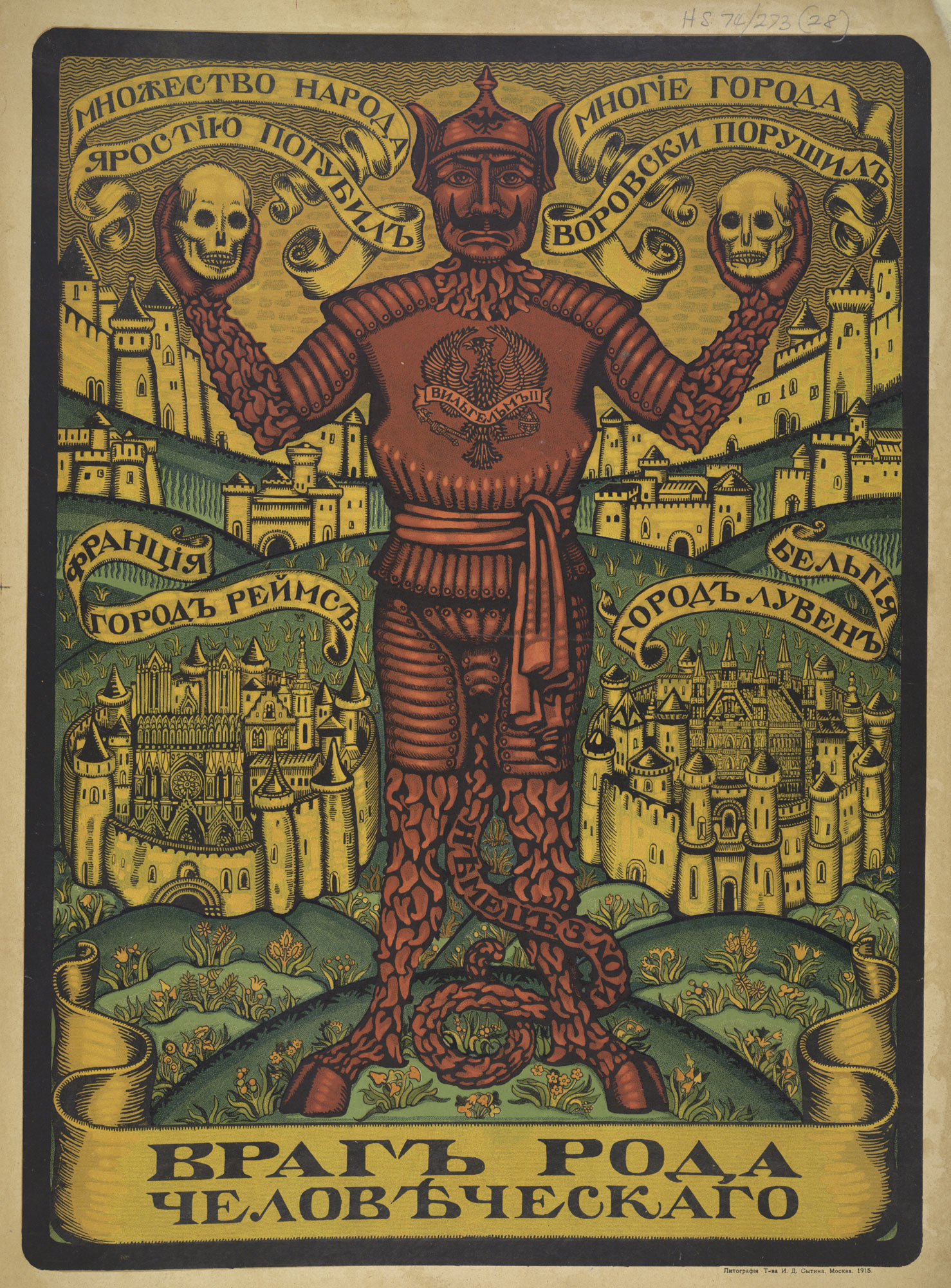 This Russian poster, “The Enemy of Humankind,” depicts Kaiser Wilhelm II, the last German Emperor and King of Prussia, who was largely blamed for World War I, as a devil with cloven hooves holding human skulls.