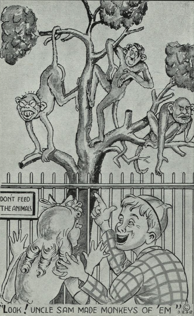 Postcard portraying Axis leaders – Hitler, Hirohito, and Mussolini – as monkeys in a zoo.