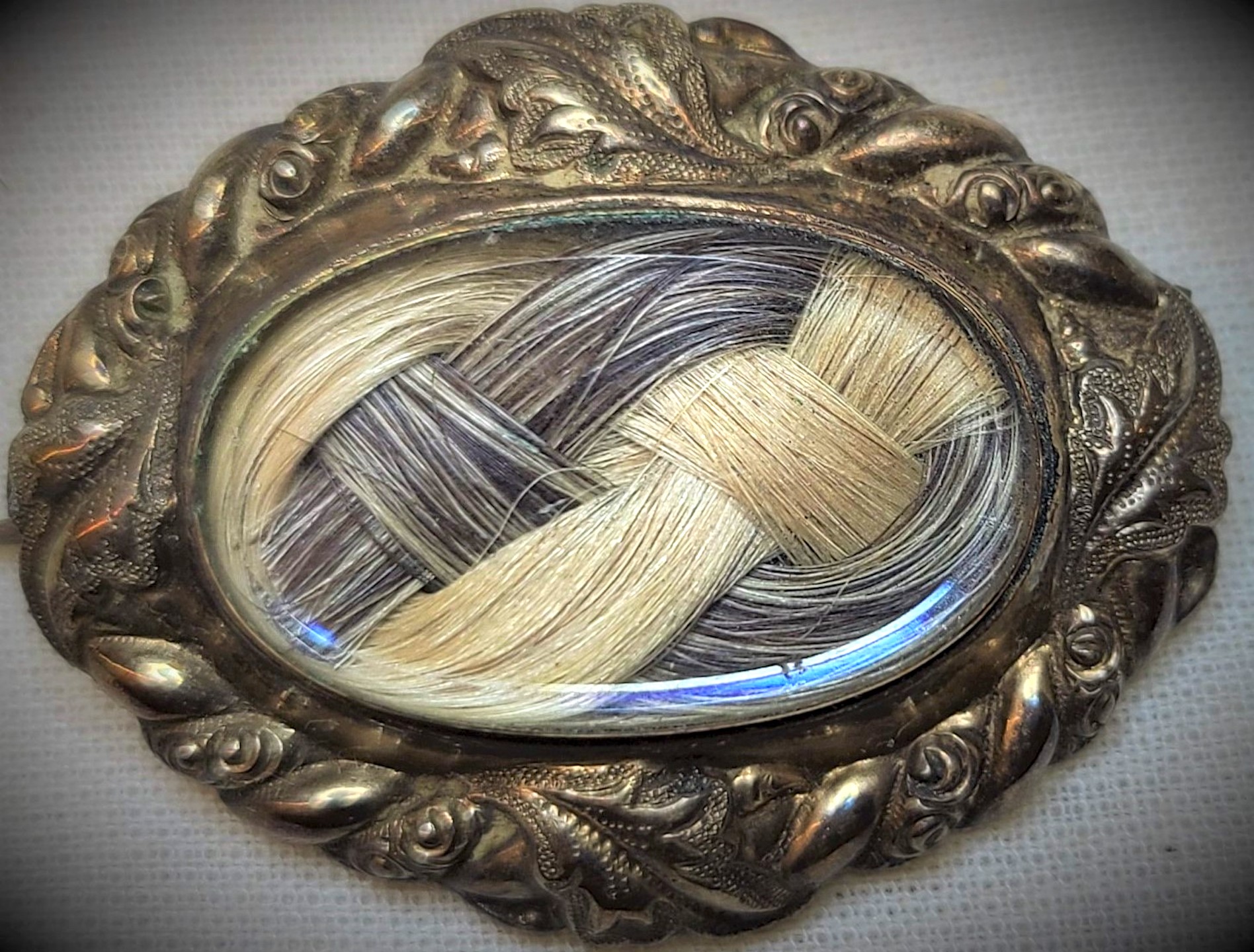 Brooch and earrings made of hair and wire, a brooch containing hair and a black bonnet.