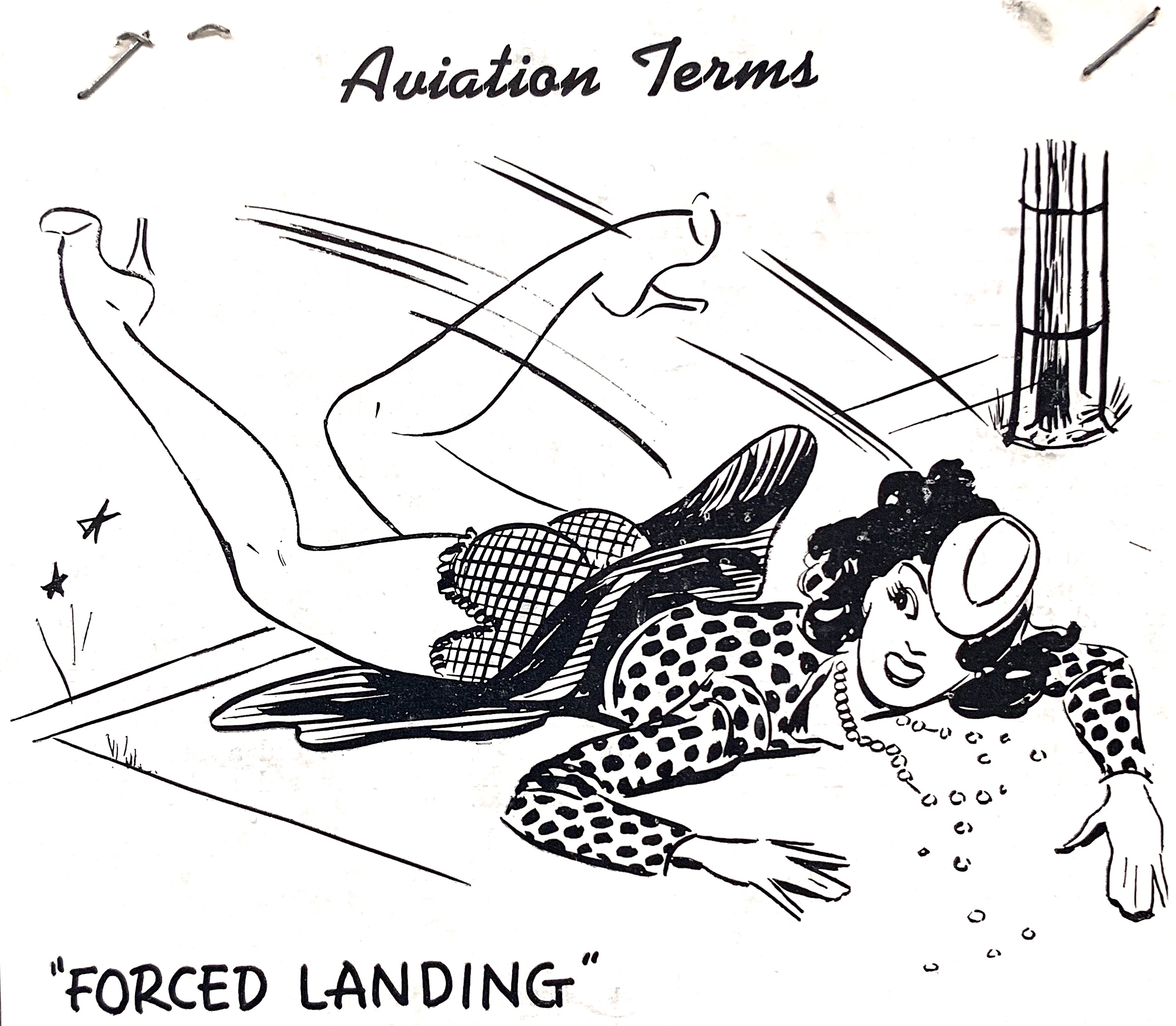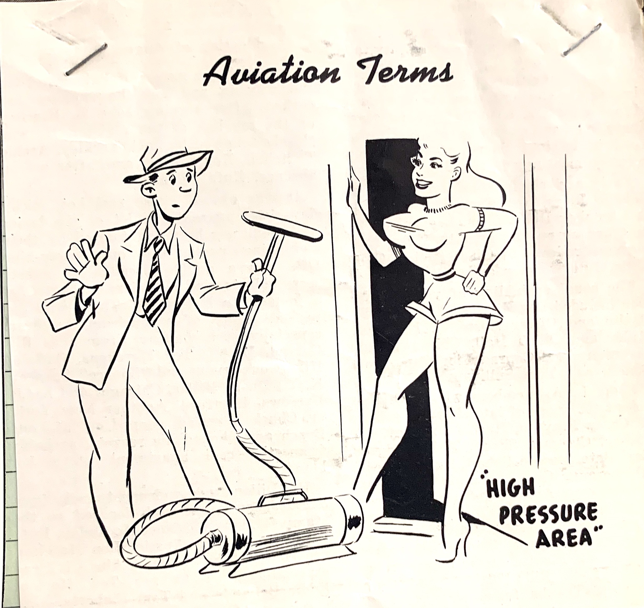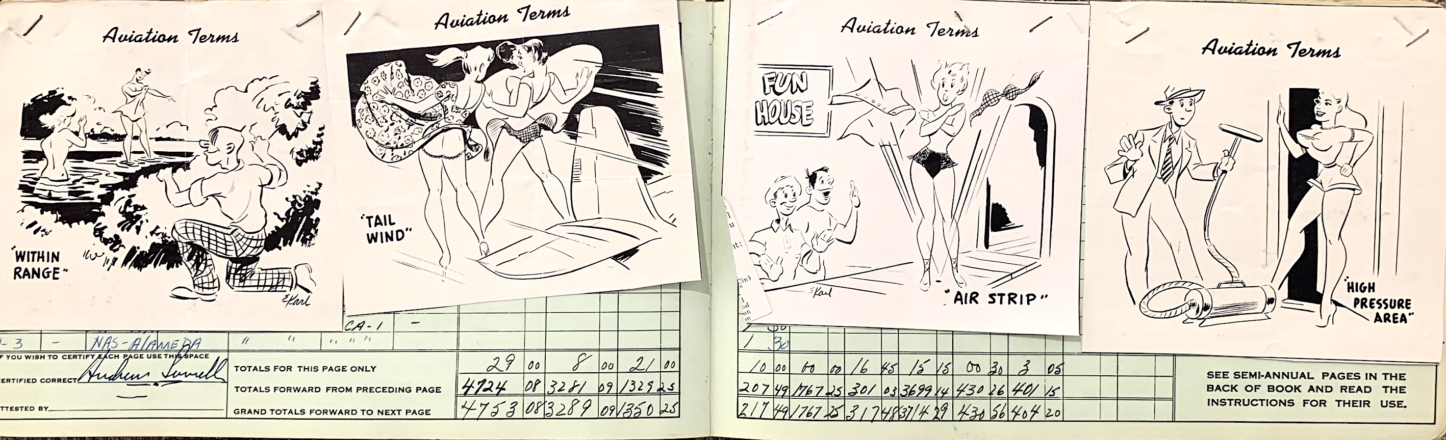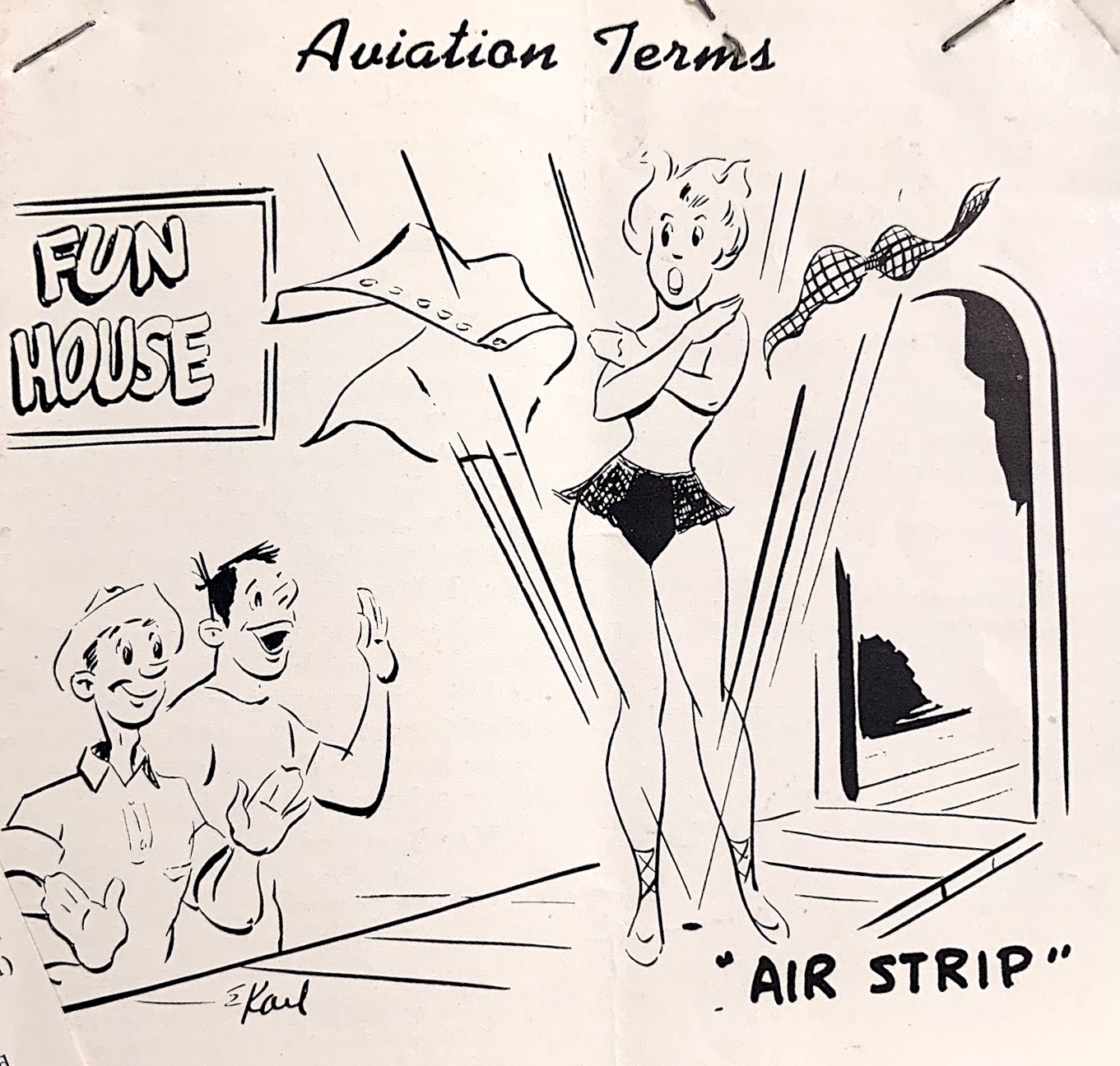 The sexualized cartoons below were found in a flight log belonging to Captain Andrew Serrell. Captain Andrew Serrell was a decorated U.S. Navy pilot who served in the World War II’s Pacific Theater and later flew aerial reconnaissance during the Cold War. During this time period, he maintained detailed flight logs that included many columns of data. Attached to most of the pages of his flight log are clippings showing sexualized cartoon depictions of numerous aviation terms.