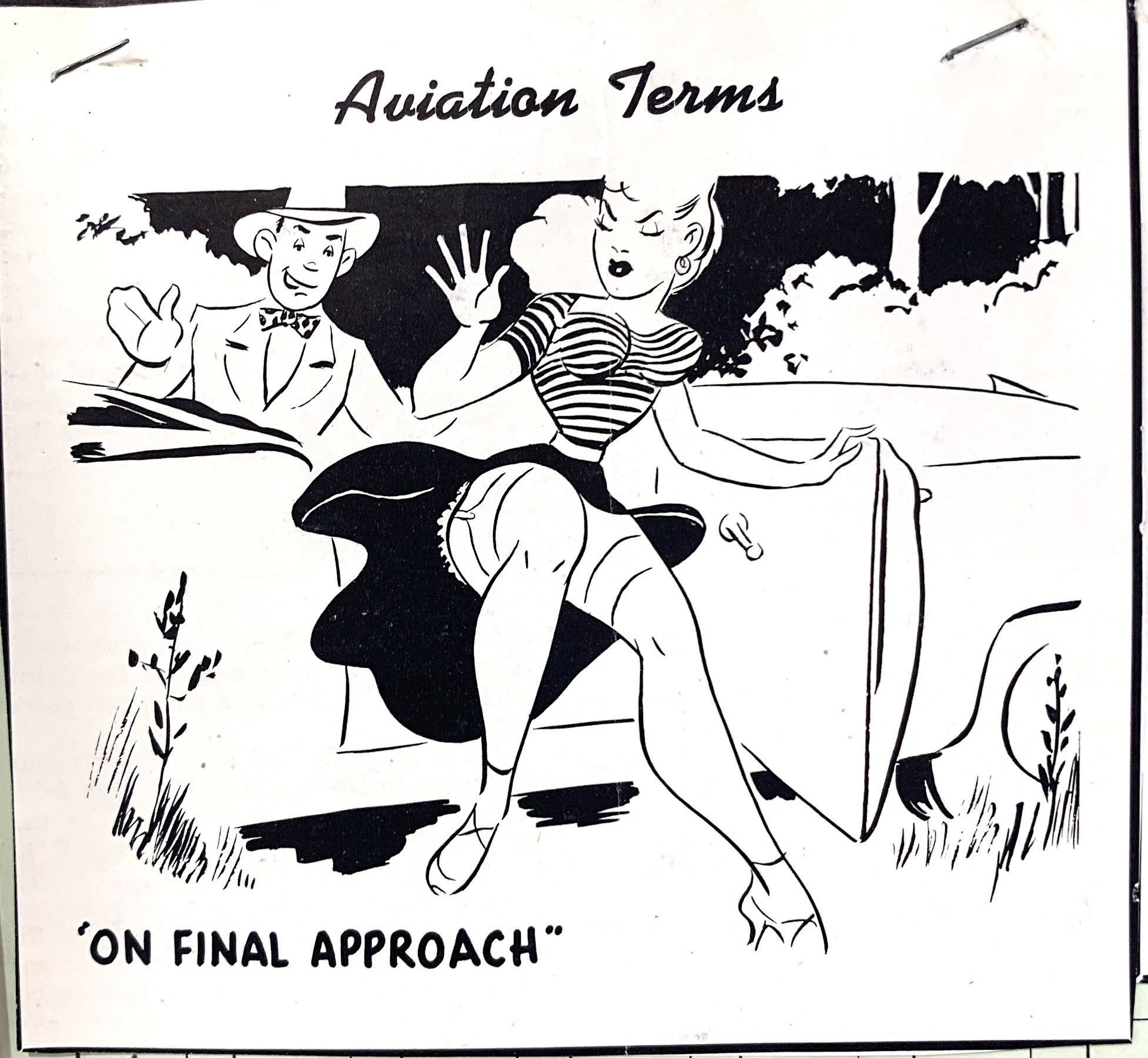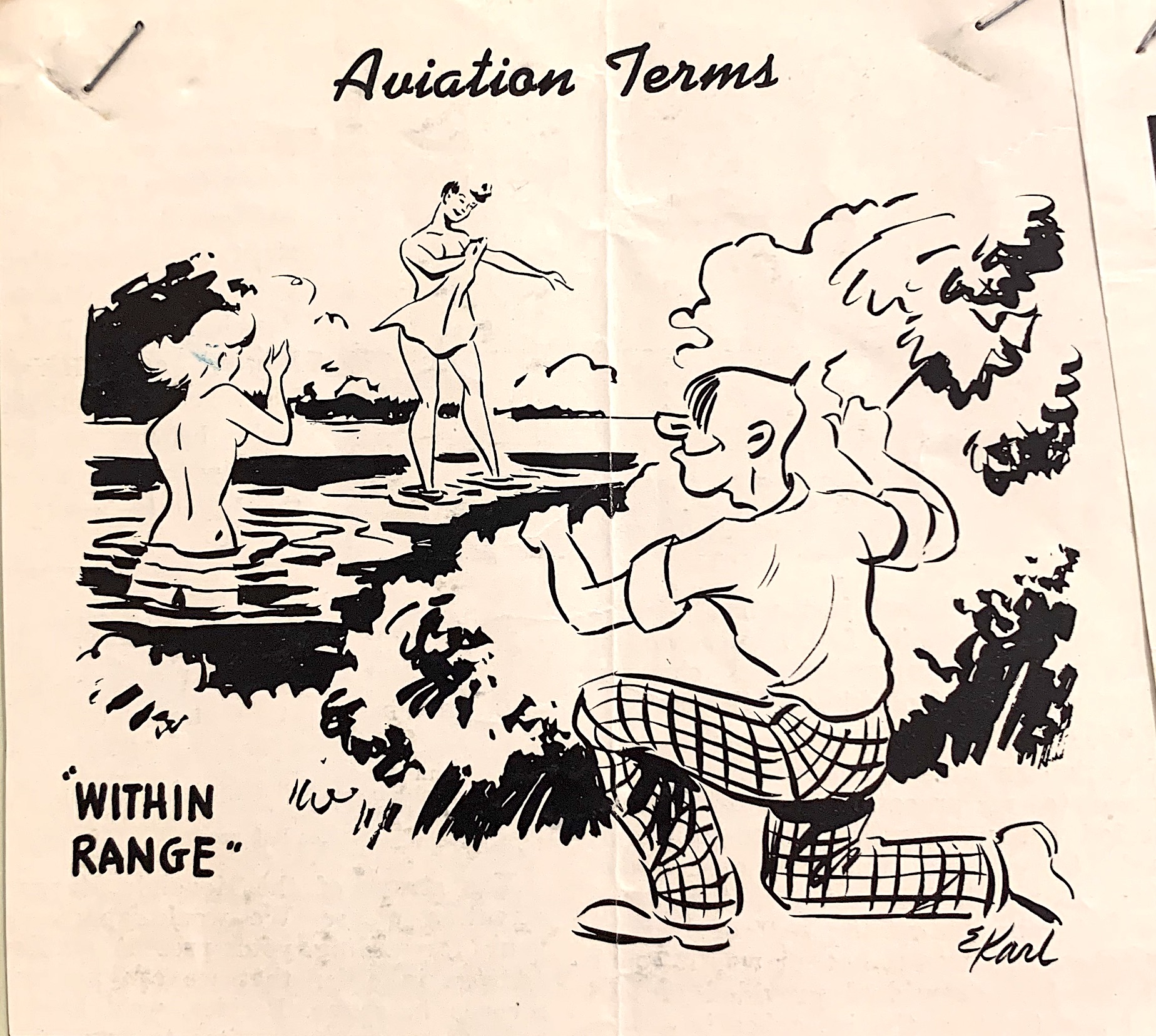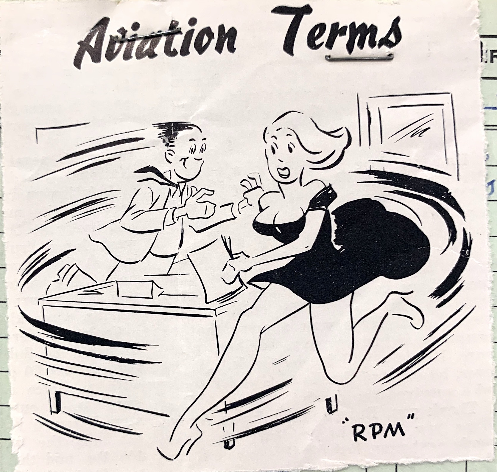 The sexualized cartoons below were found in a flight log belonging to Captain Andrew Serrell. Captain Andrew Serrell was a decorated U.S. Navy pilot who served in the World War II’s Pacific Theater and later flew aerial reconnaissance during the Cold War. During this time period, he maintained detailed flight logs that included many columns of data. Attached to most of the pages of his flight log are clippings showing sexualized cartoon depictions of numerous aviation terms.