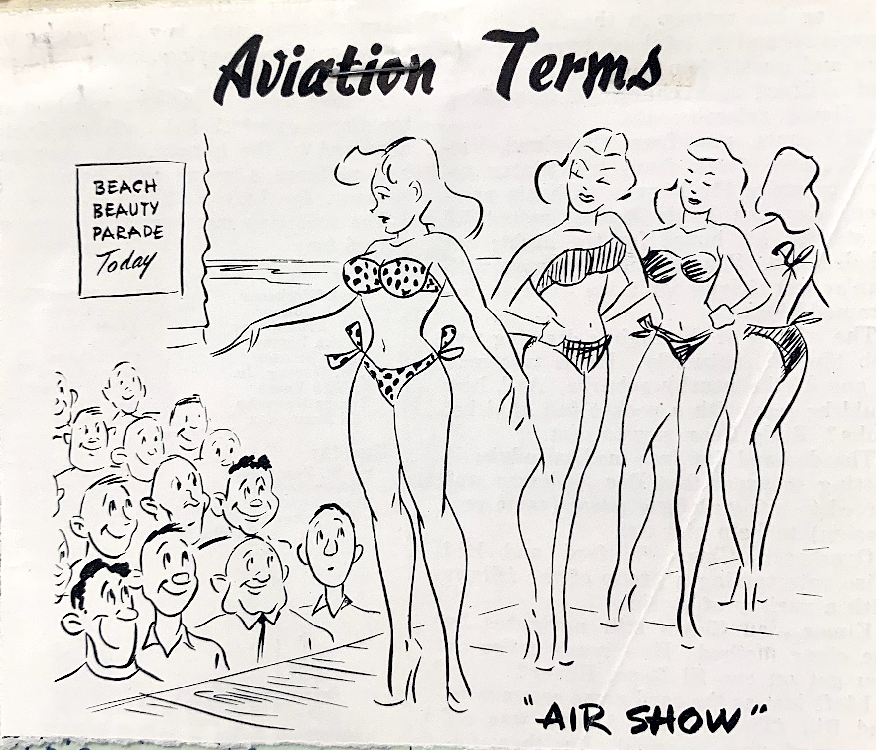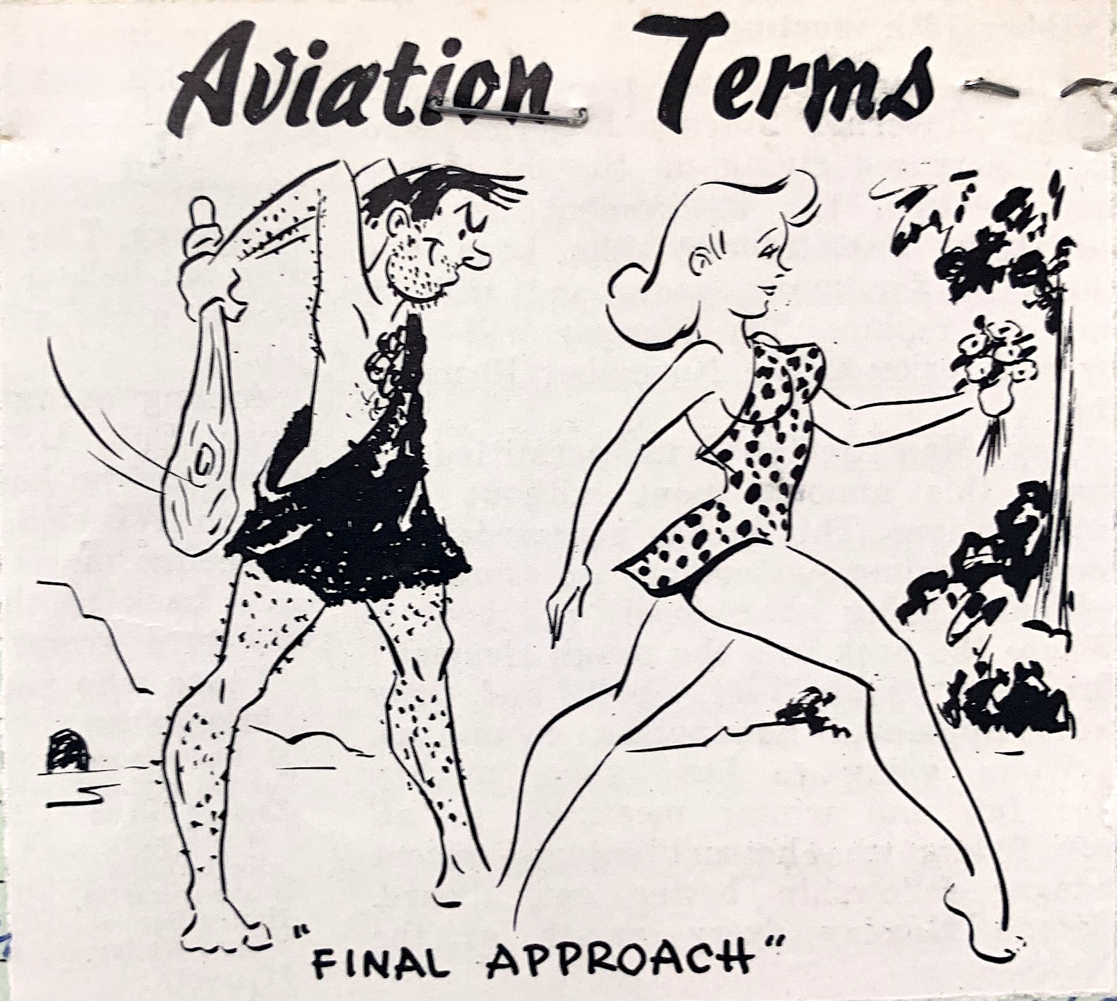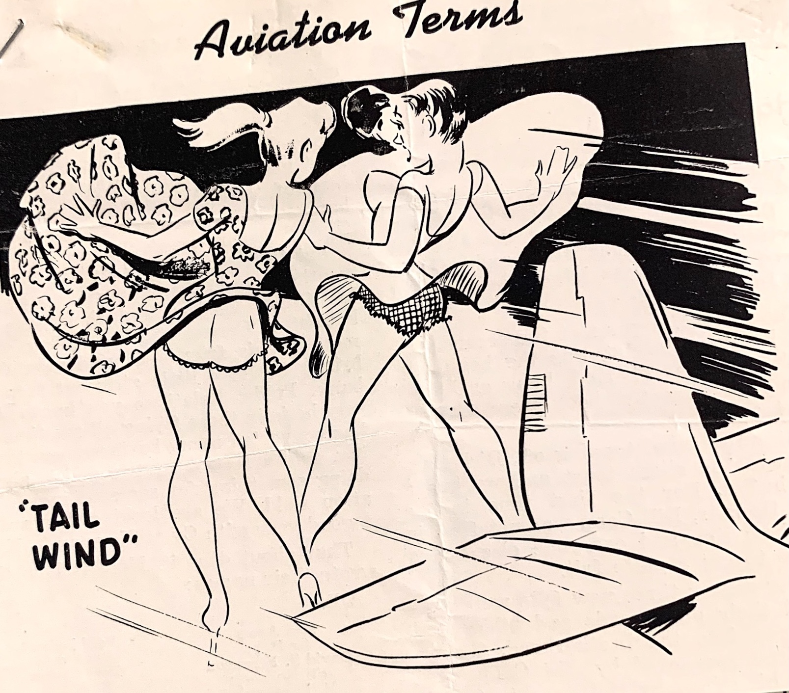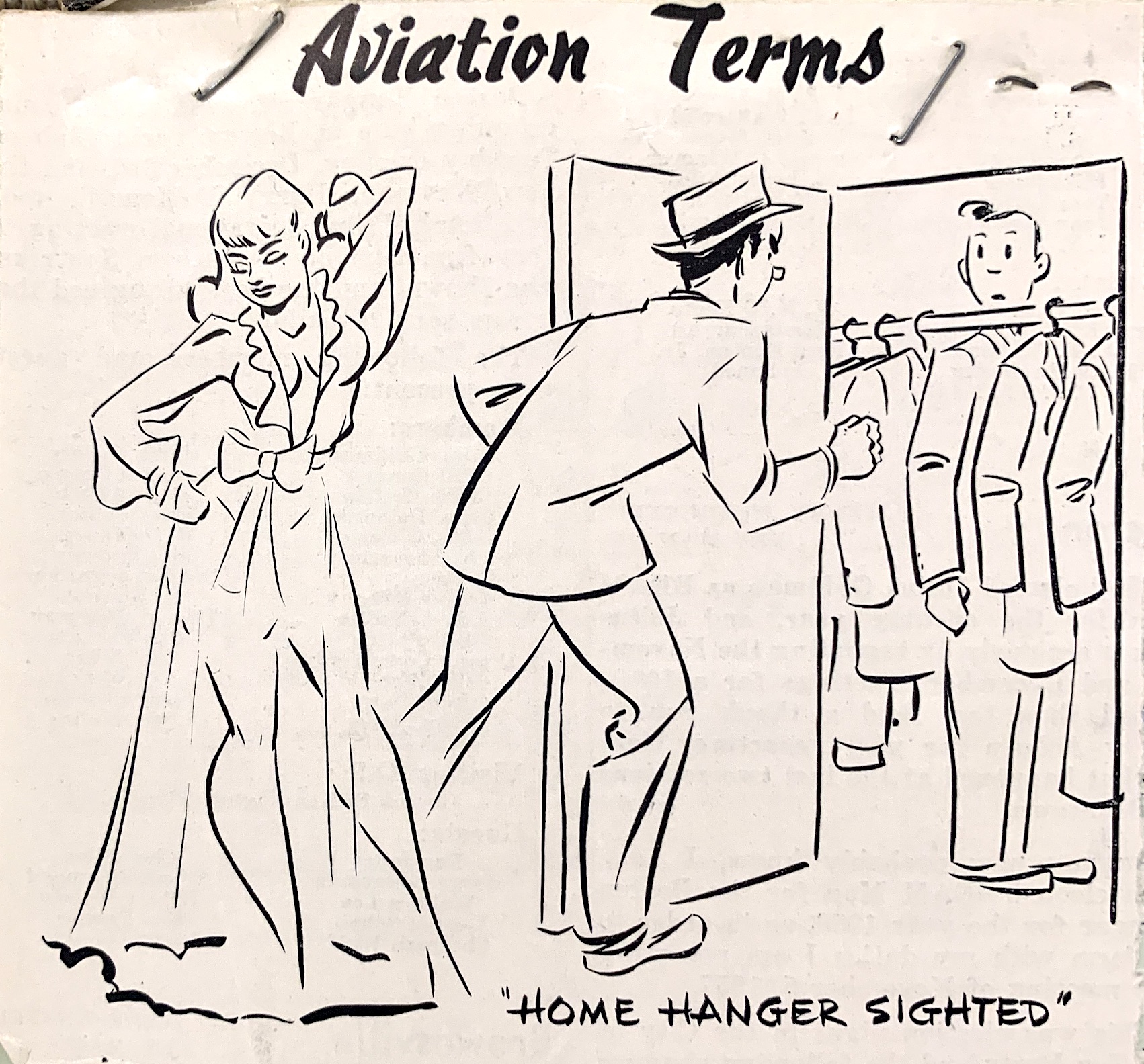 The sexualized cartoons below were found in a flight log belonging to Captain Andrew Serrell. Captain Andrew Serrell was a decorated U.S. Navy pilot who served in the World War II’s Pacific Theater and later flew aerial reconnaissance during the Cold War. During this time period, he maintained detailed flight logs that included many columns of data. Attached to most of the pages of his flight log are clippings showing sexualized cartoon depictions of numerous aviation terms.