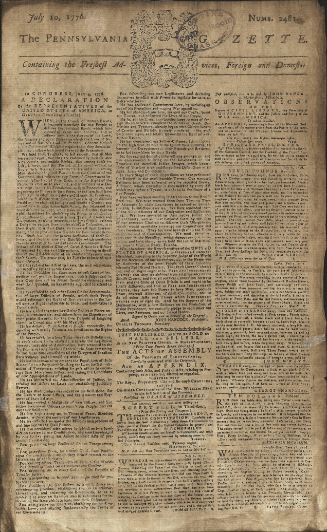 Pennsylvania Gazette from July 1776 with the newly drafted Declaration of Independence printed on the front cover.