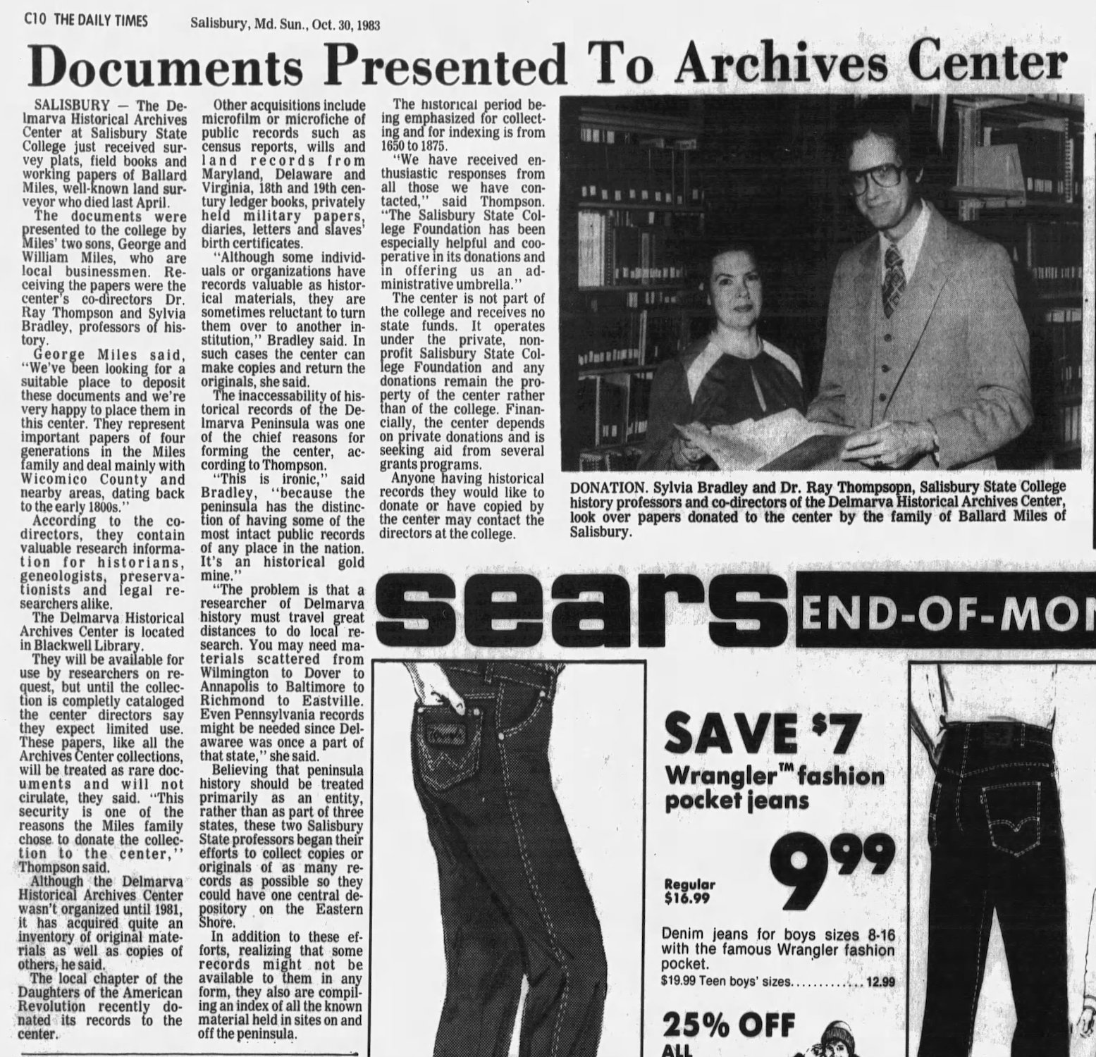 Newspaper article detailing the donation of Ballard Miles papers to the Delmarva Historical Archives Center at Salisbury State College - October 30, 1983