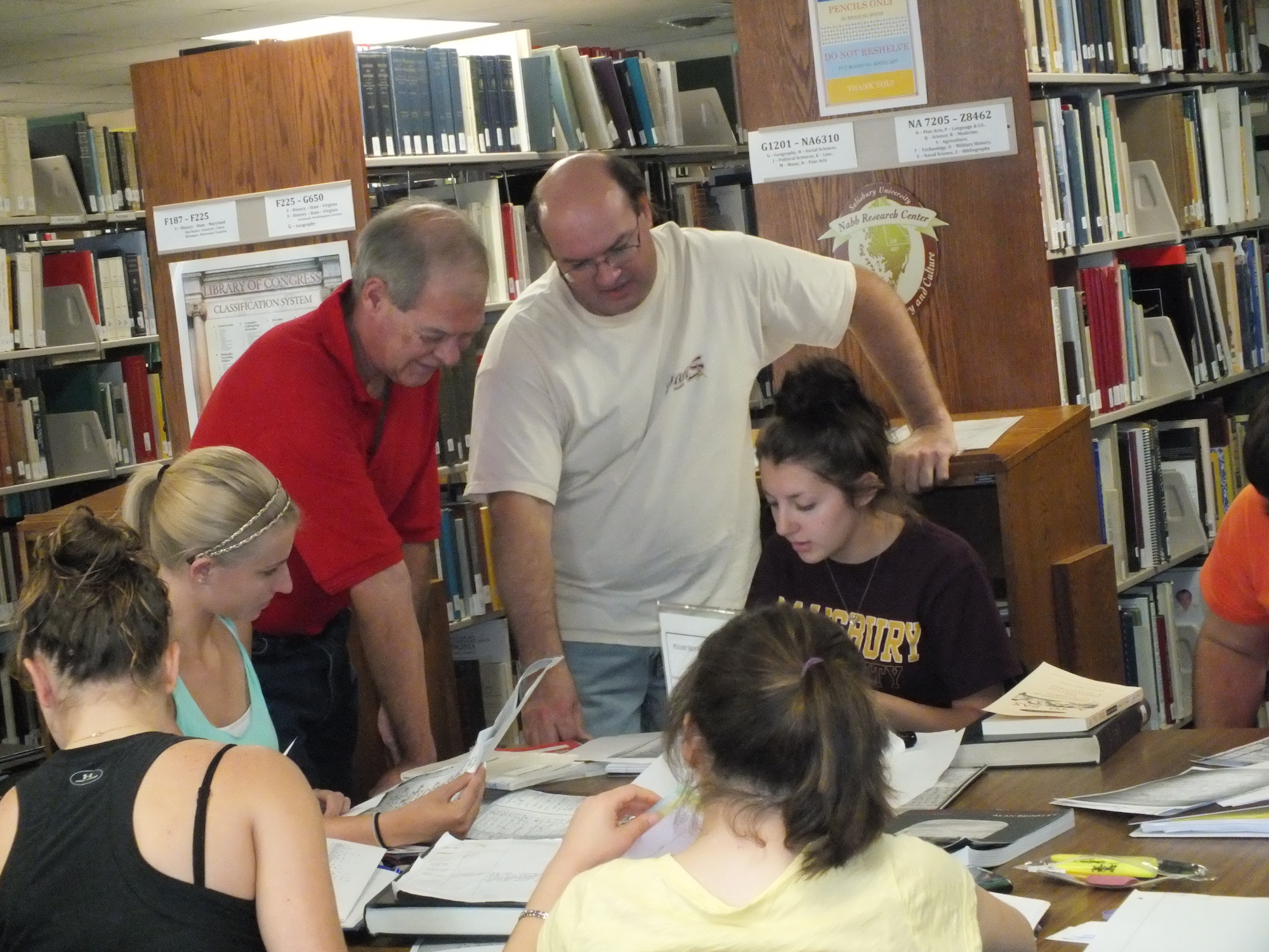 Photo of Aaron Horner working with Salisbury University students working with primary resources