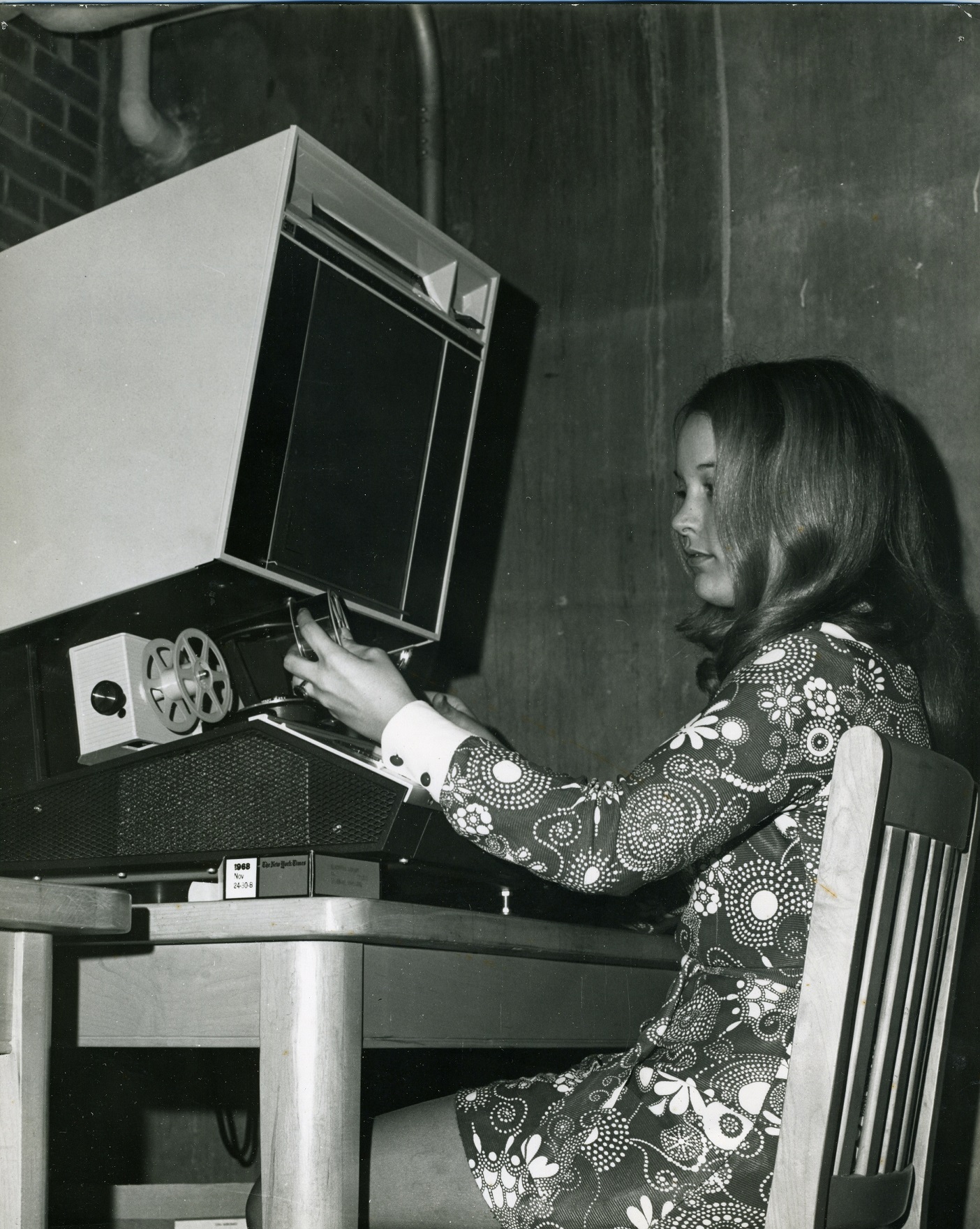 Student reading the New York Times on microfilm reader, circa 1969