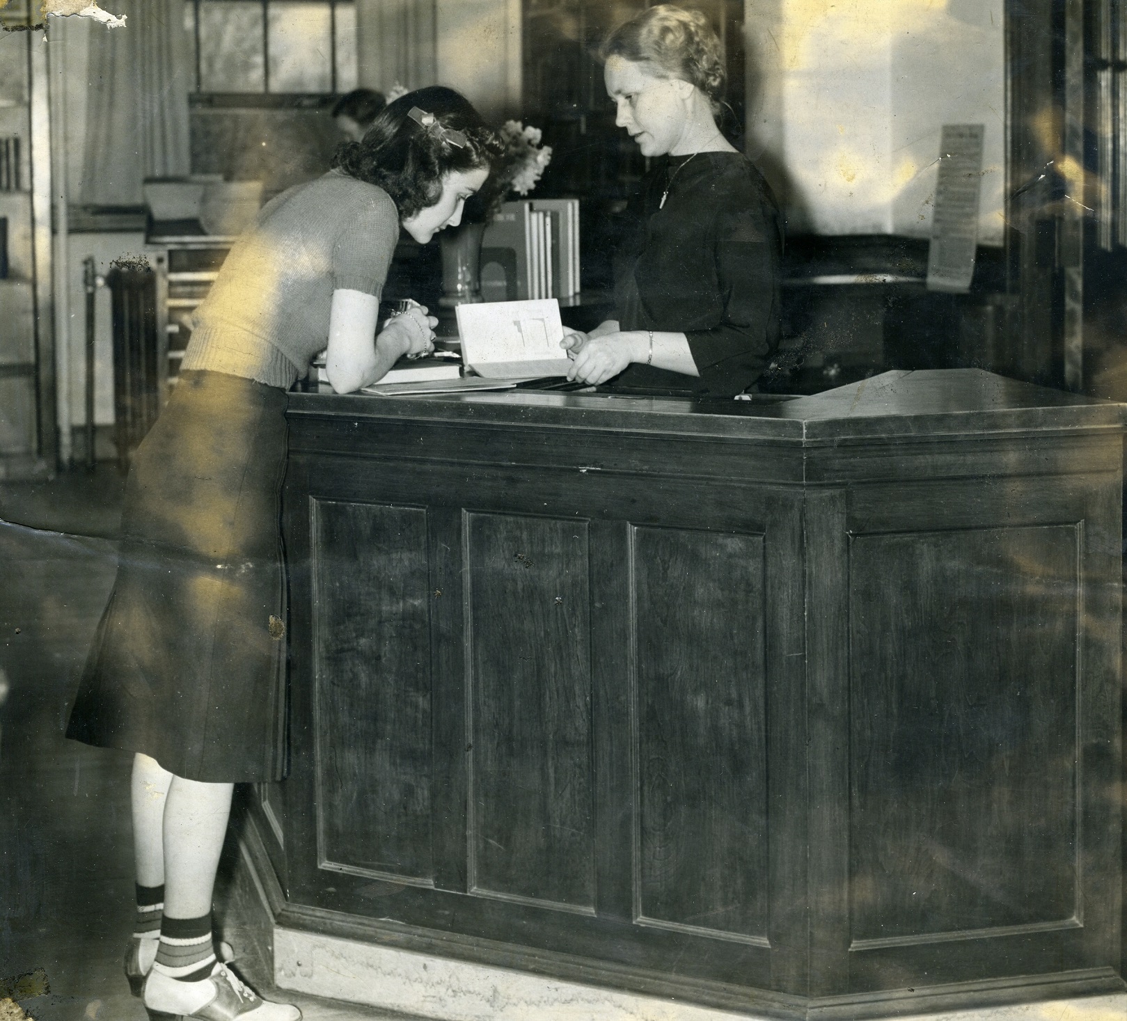 Grace Chaires (Librarian, 1937-1969) at circulation desk