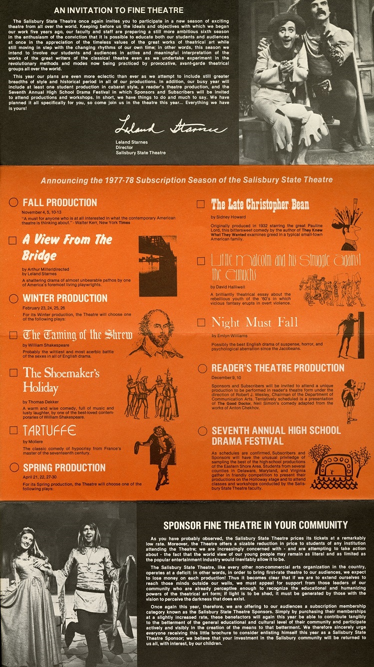 Salisbury State Theatre, “Salisbury State Theatre Subscription Flyer, 1977-1978,” Nabb Research Center Online Exhibits, accessed December 13, 2025, http://www.sulibraries.org/nabb-online/items/show/187.