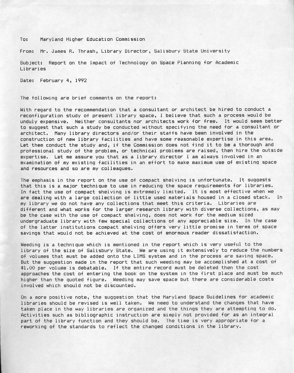 Blackwell Library Director, James Thrash, comments to the Maryland Higher Education Commission on the report entitled "Impact of Technology on Space Planning for Academic Libraries." February 4, 1992.