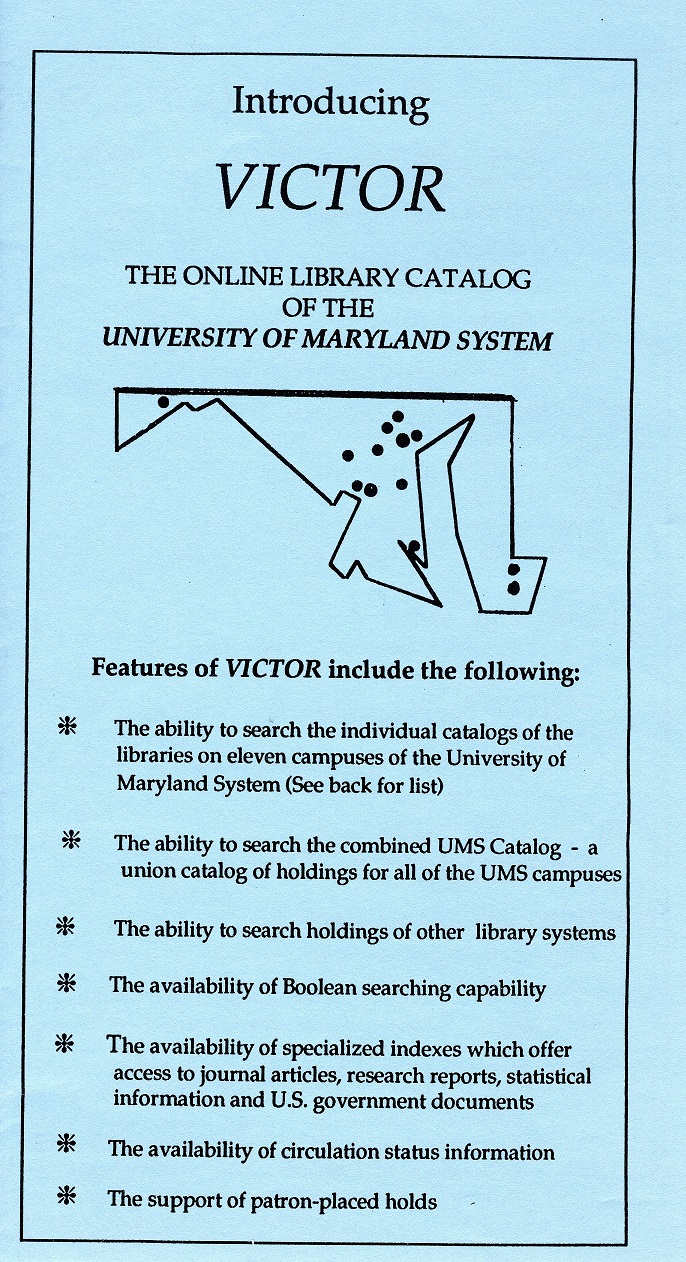 Salisbury University Libraries, “VICTOR Online Catalog Guide, 1995,” Nabb Research Center Online Exhibits, accessed December 14, 2025, http://www.sulibraries.org/nabb-online/items/show/223.