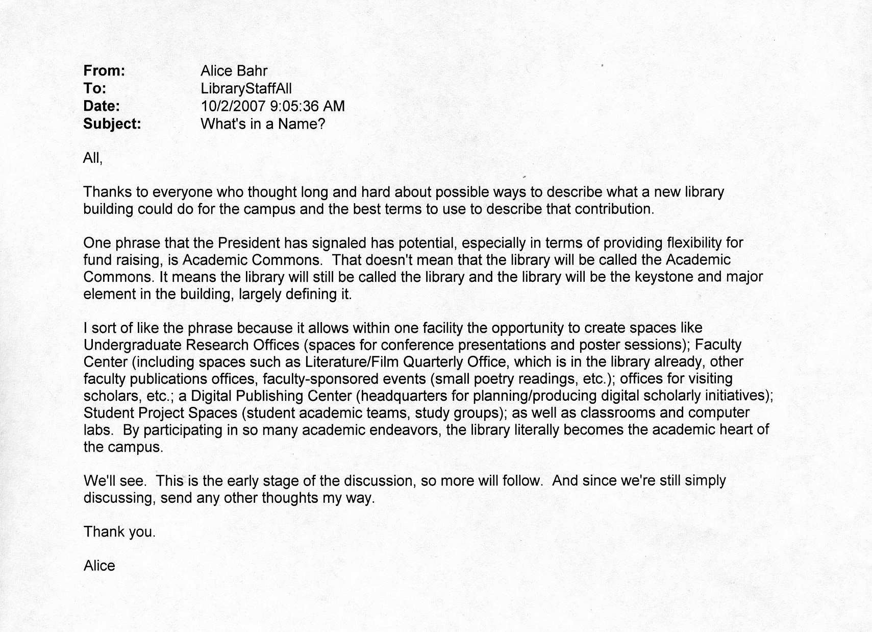 Alice Bahr's (Blackwell Library Director) 2007 e-mail to staff about "What's in a Name?"