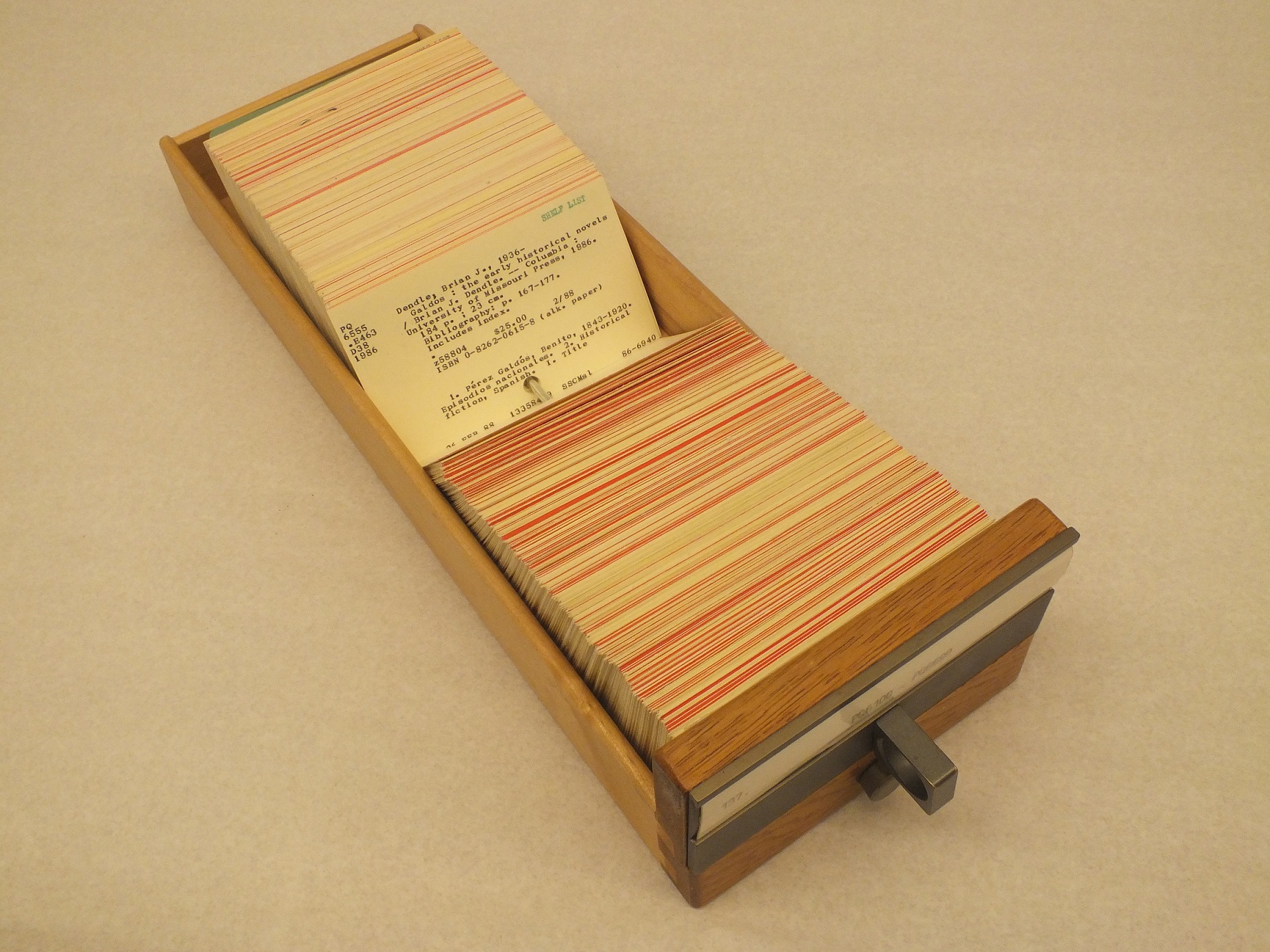 Drawer containing cards from the card catalog that was used to find books within the stacks until 2005. They were replaced with an online system.