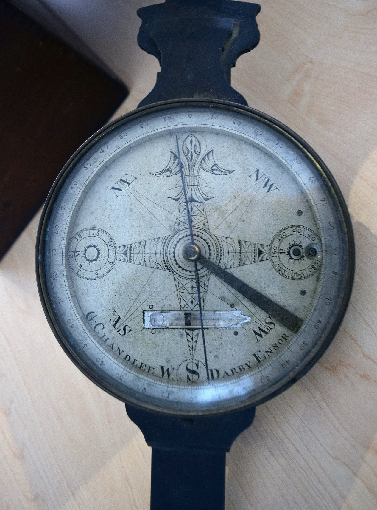 Surveyor's compass made by Goldsmith Chandlee for Darby Ensor (1741-1825). Darby Ensor was the deputy surveyor for Baltimore County. He surveyed lots around the inner harbor of Baltimore City from 1808 to 1823.