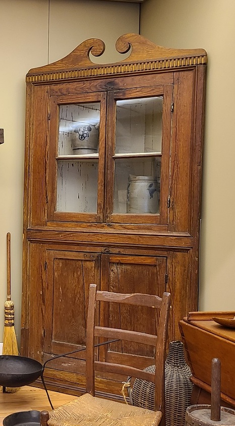 Corner cupboard originally from Accomack County Virginia and most likely made in the late 18th century and moved to the Liberty Hall plantation home in Somerset County, Maryland, by the Whealton family. Cupboards were typically designed for displaying dishware, including plates, cups, and saucers.