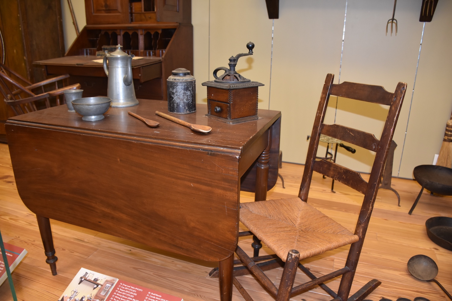 Photograph of (left to right), cup, teapot, bowl, mixing spoons, tea jar, and coffee mill, Rush bottom rocking chair, on display at the Nabb Research Center