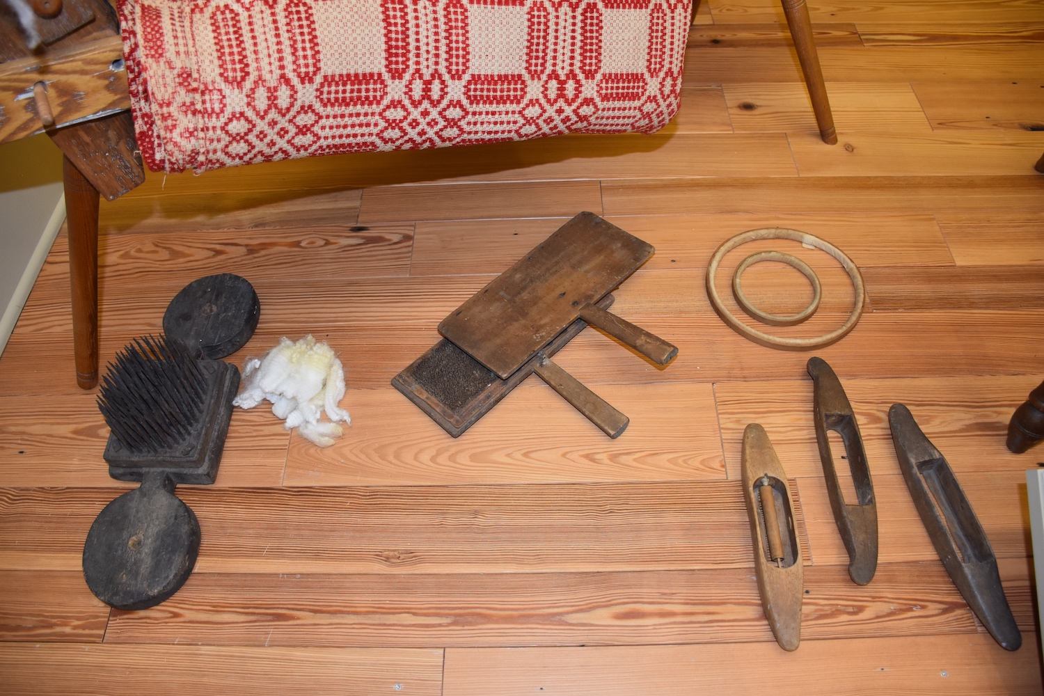Photograph (left to right) flax Breaker: used to comb out knots in flax and leave long, silky threads, a pile of wool, weaving shuttle: used to hold and move yarn back and forth while weaving, wool carders: used to clean and untagle wool before spinning and embroidery hoops.
