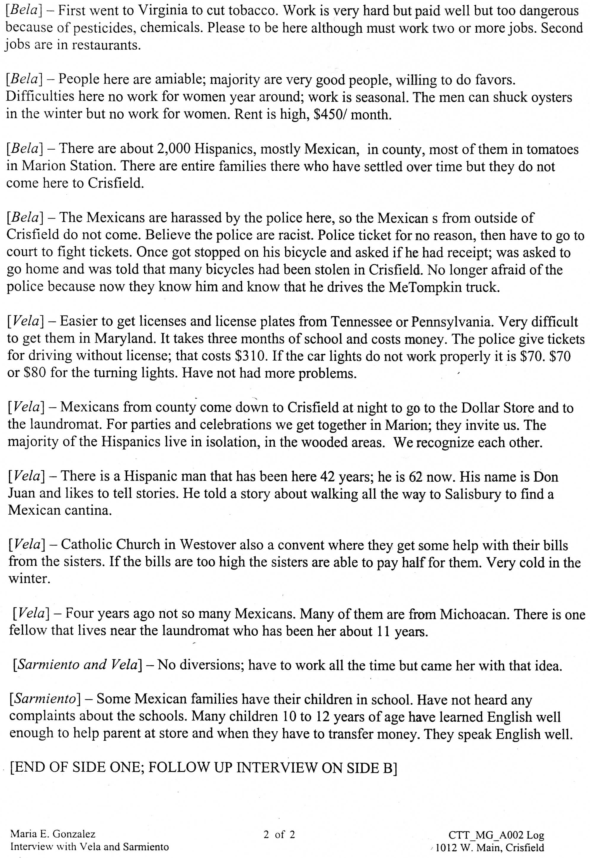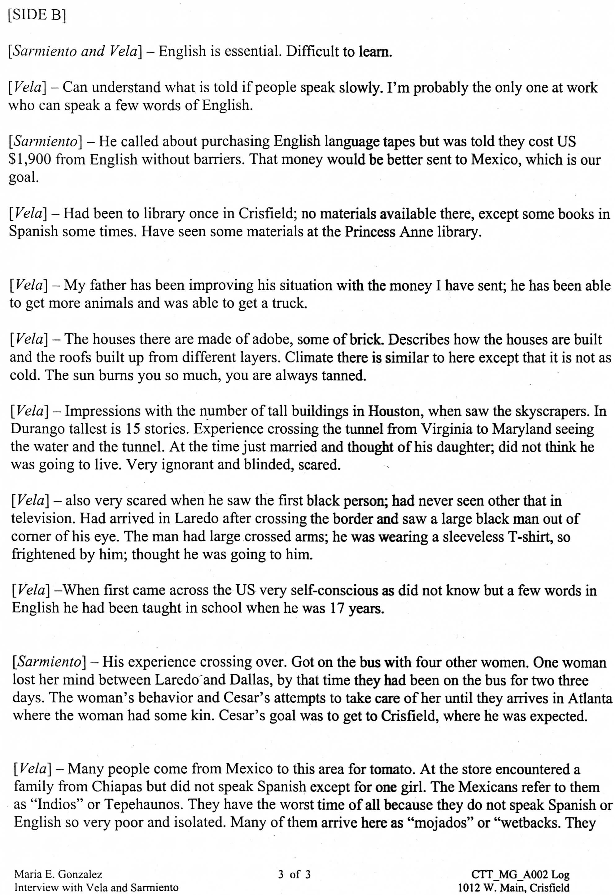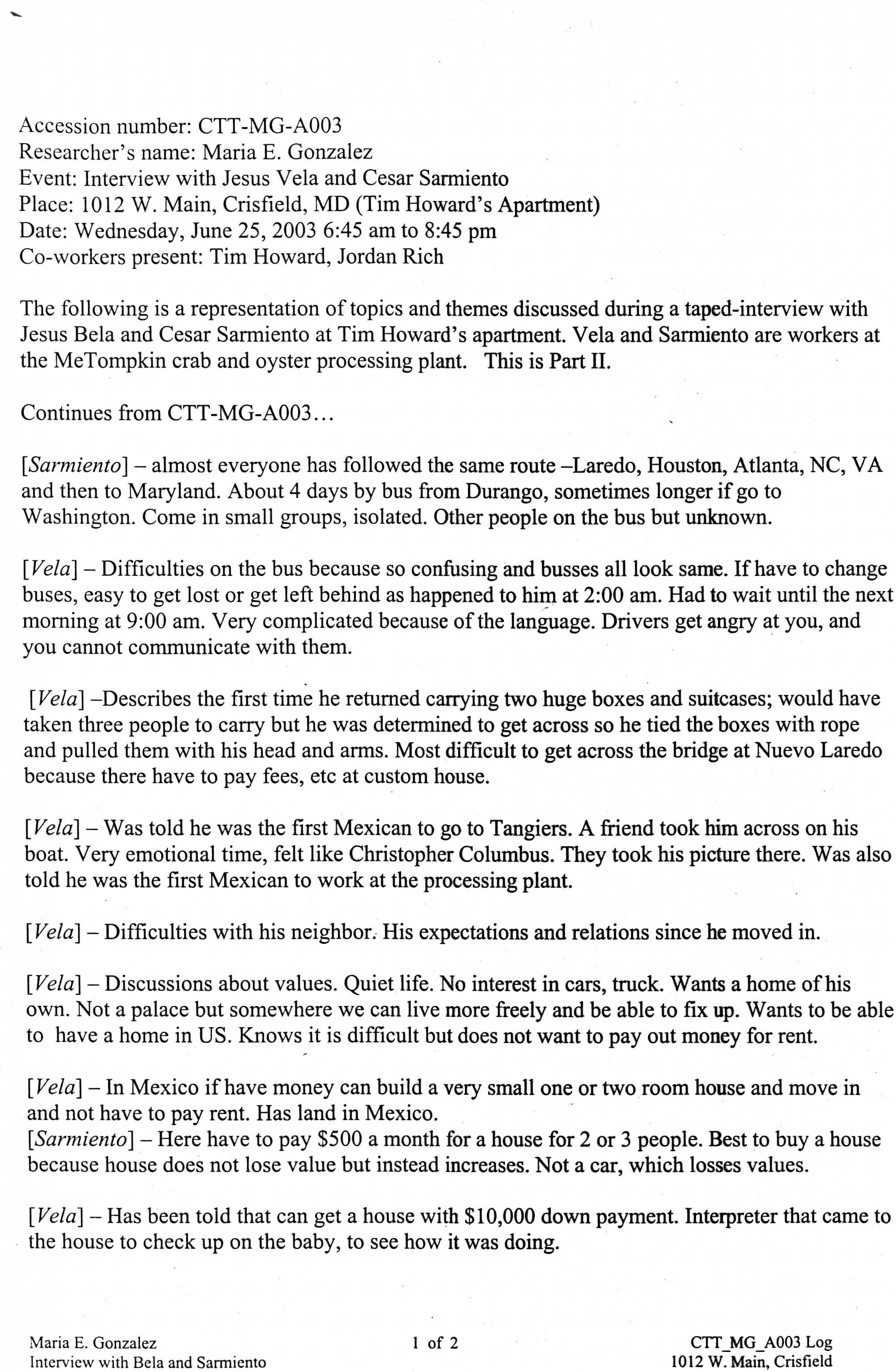 Interviewer - Maria E. Gonzalez, “Interview Log Jesus Vela and Cesar Sarmiento,” Nabb Research Center Online Exhibits, accessed December 13, 2025, http://www.sulibraries.org/nabb-online/items/show/578.