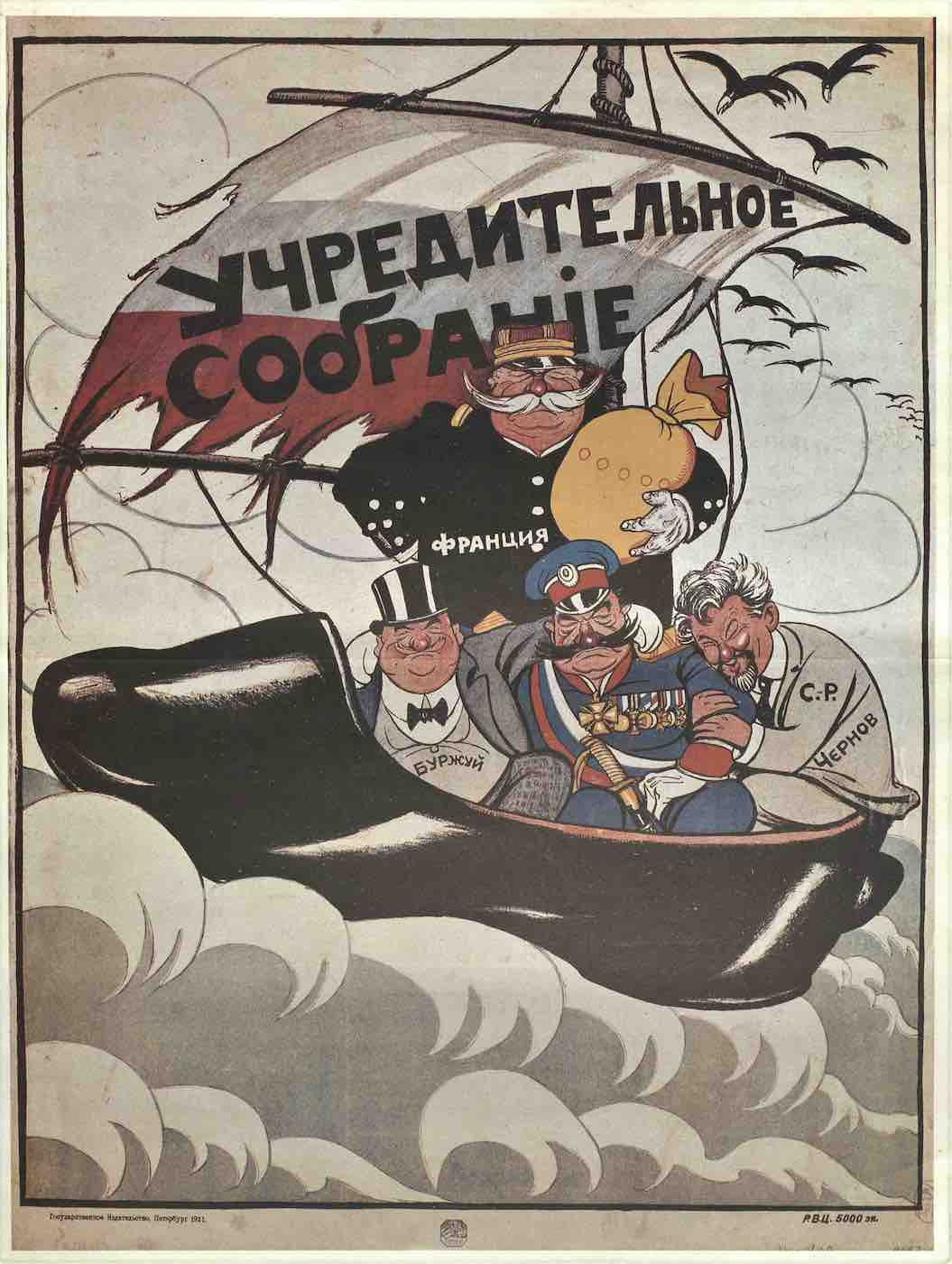 This poster by Viktor Deni portrays Viktor Chernov, the S-R President of the Constituent Assembly, being cast away at sea with a czarist general, member of the bourgeois, and France post-revolution