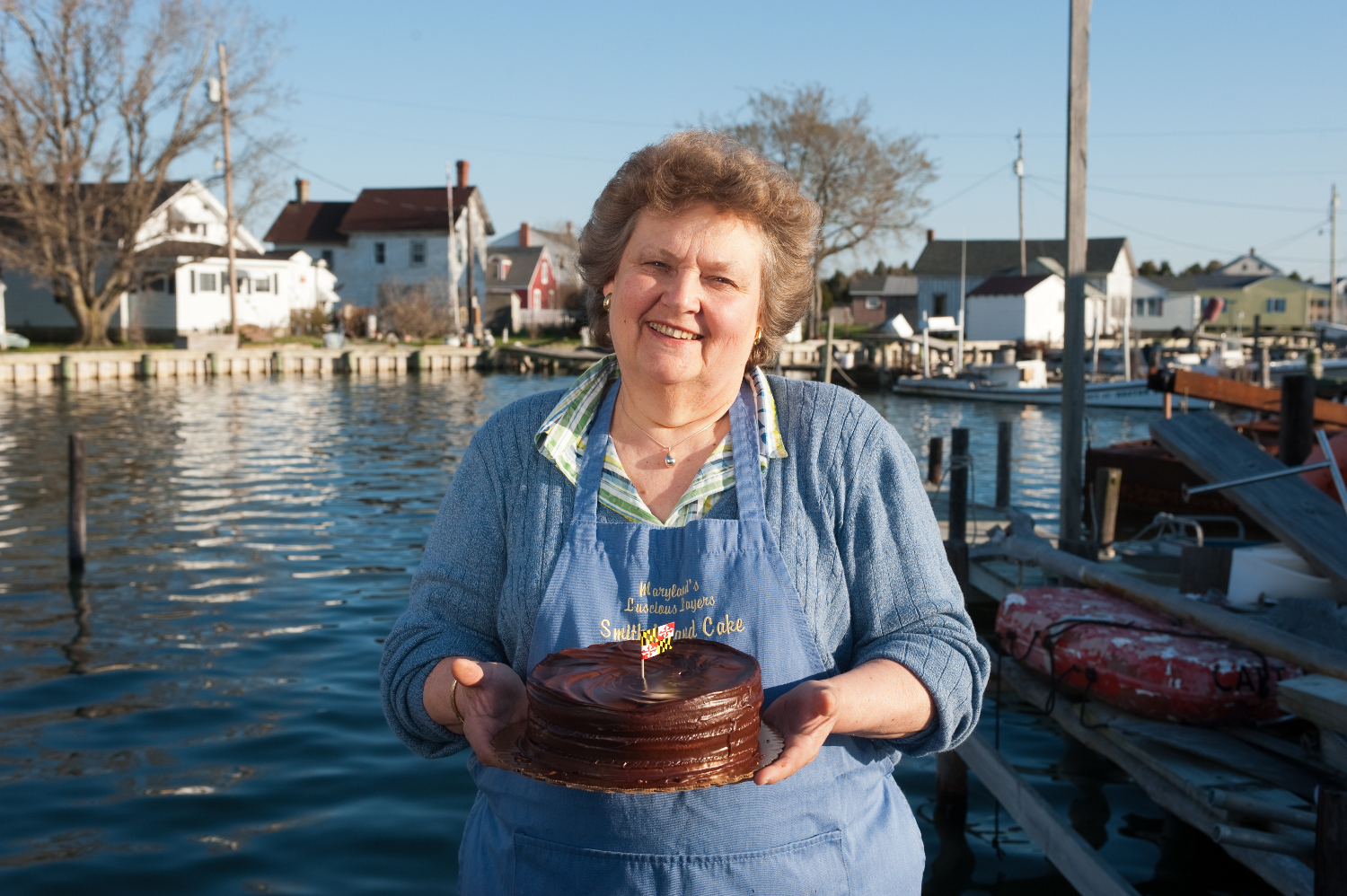 Mary Ada Marshall, on the water front of Tylerton, Smith Island, MD, holding a Smith Island Cake with a tiny Maryland flag on top.